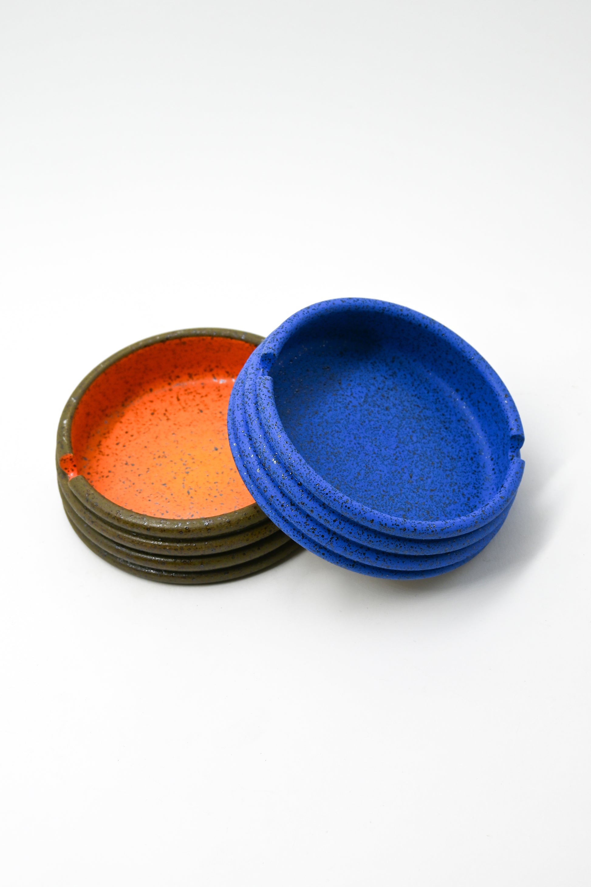 Wheel thrown stoneware ash tray with hand painted glaze design.