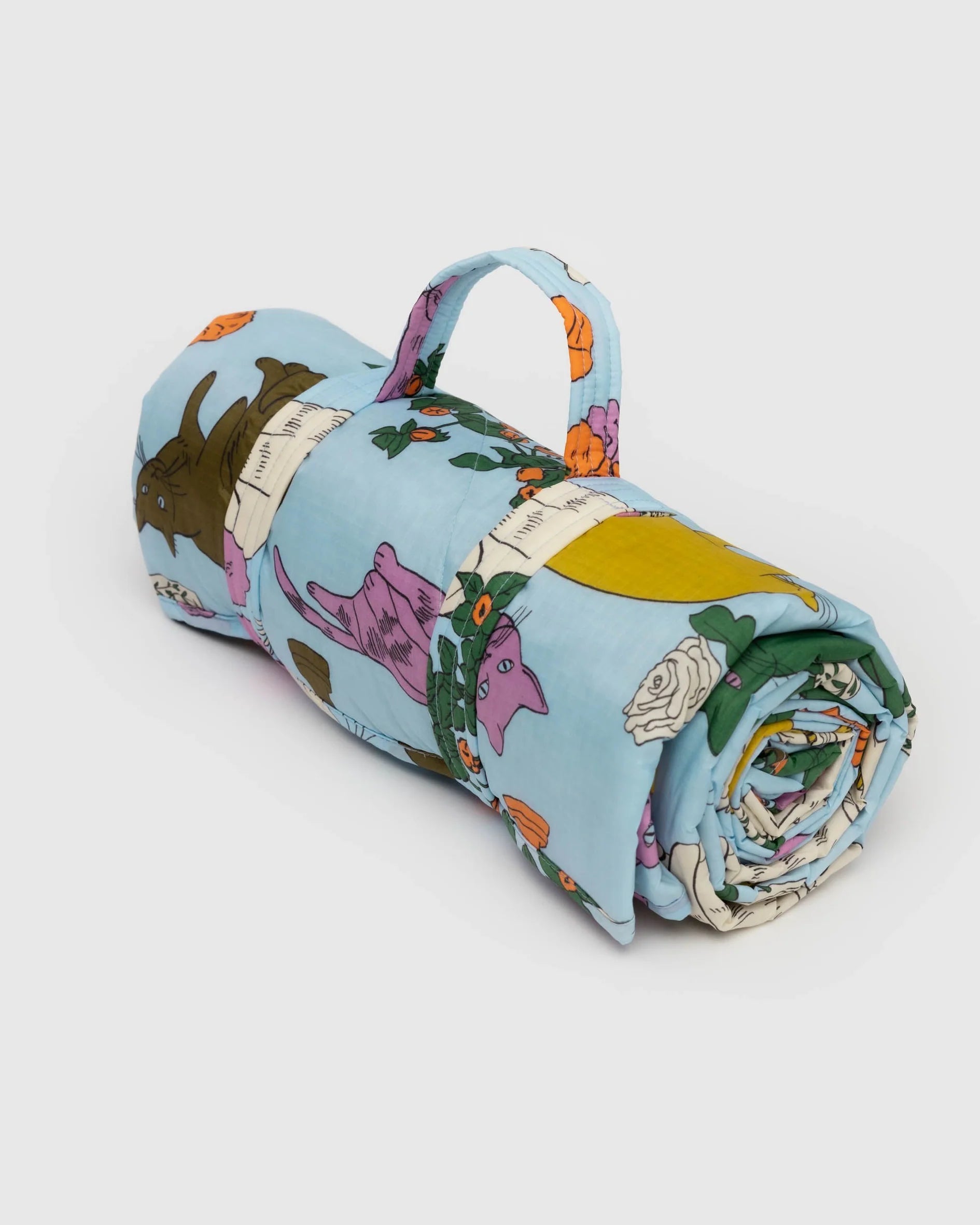 A quilted ripstop picnic blanket with carrying strap so you can roll it up and bring it anywhere.