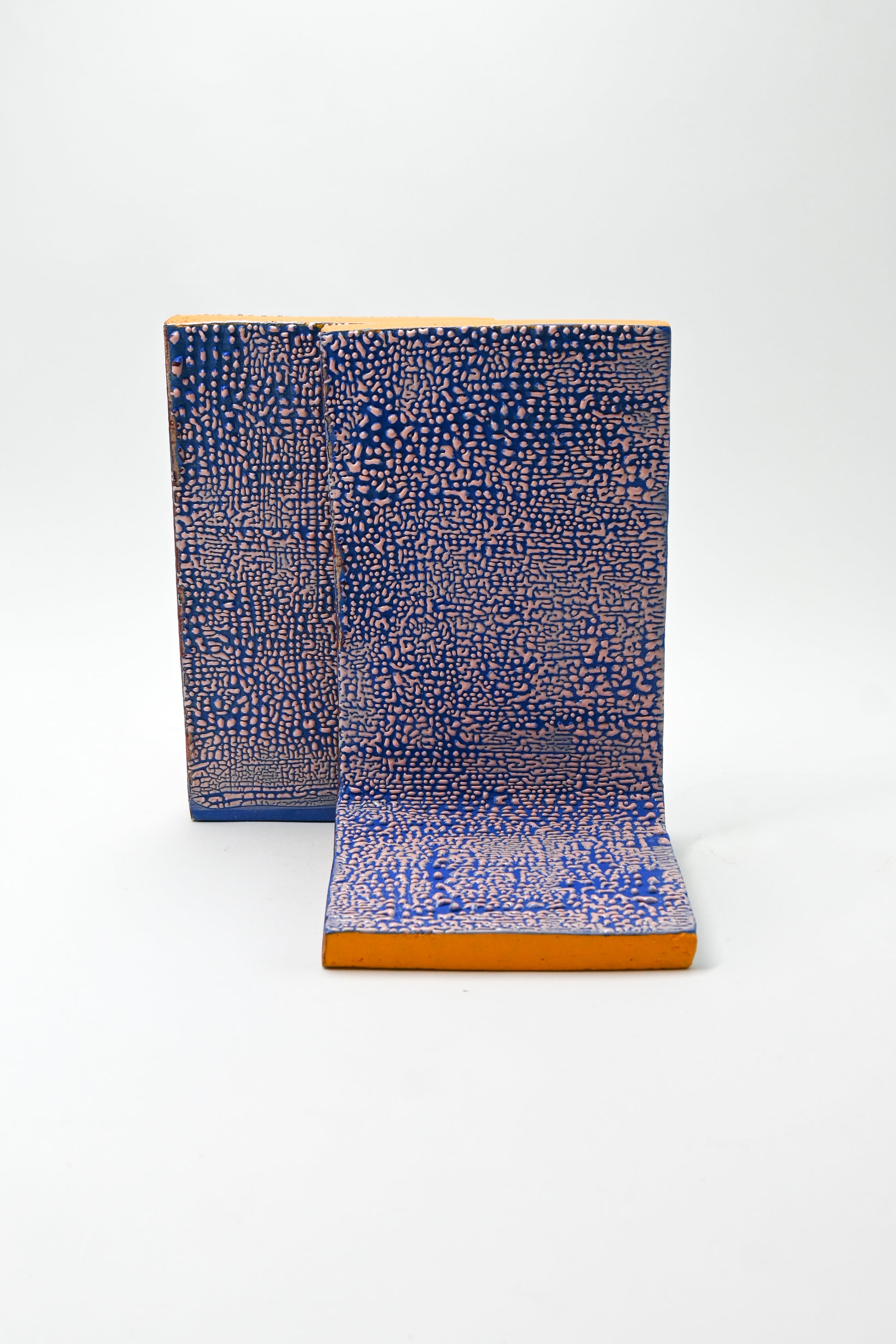 One of a kind set of sculpted stoneware bookends with hand painted glaze.