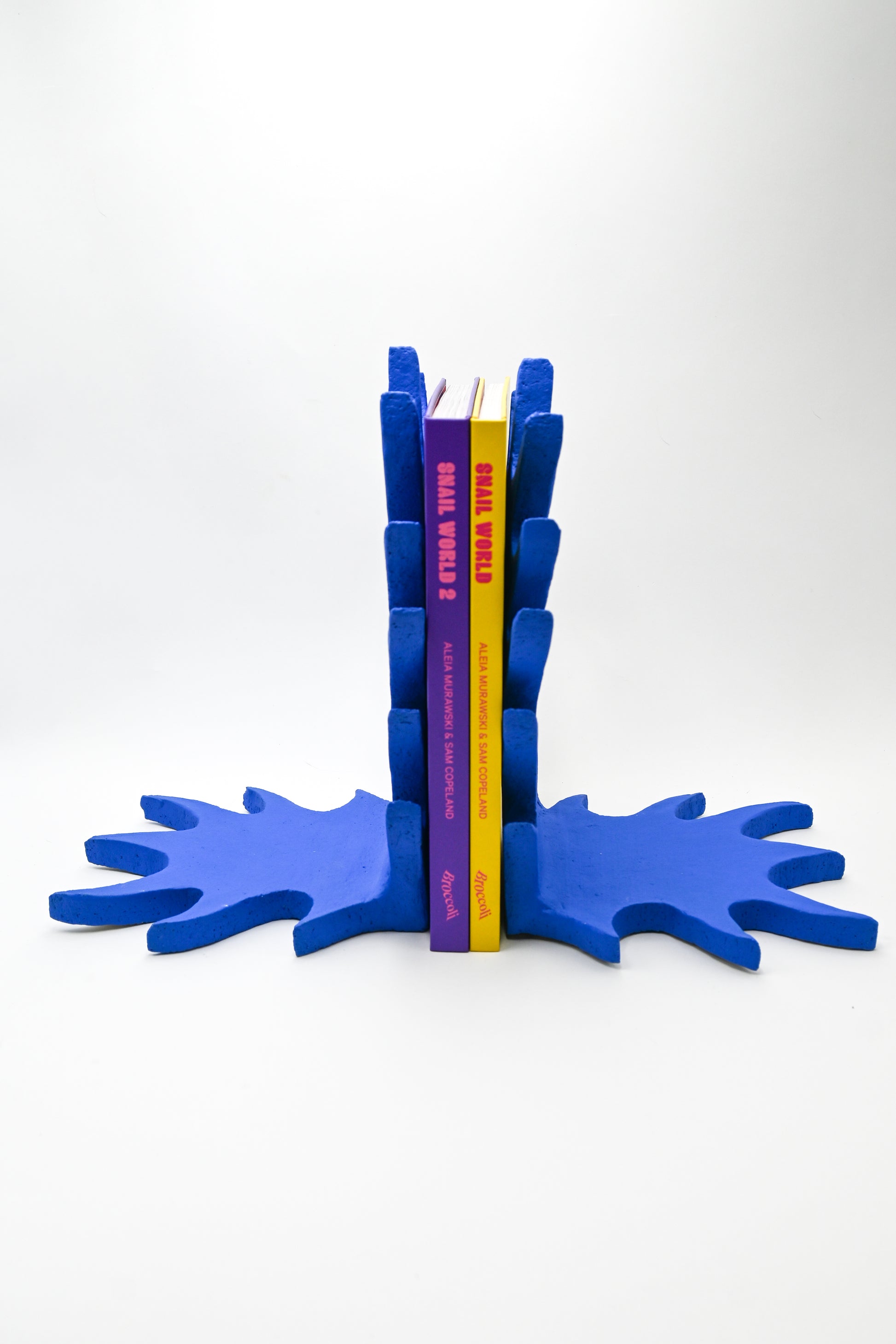 One of a kind set of sculpted stoneware bookends with hand painted glaze.