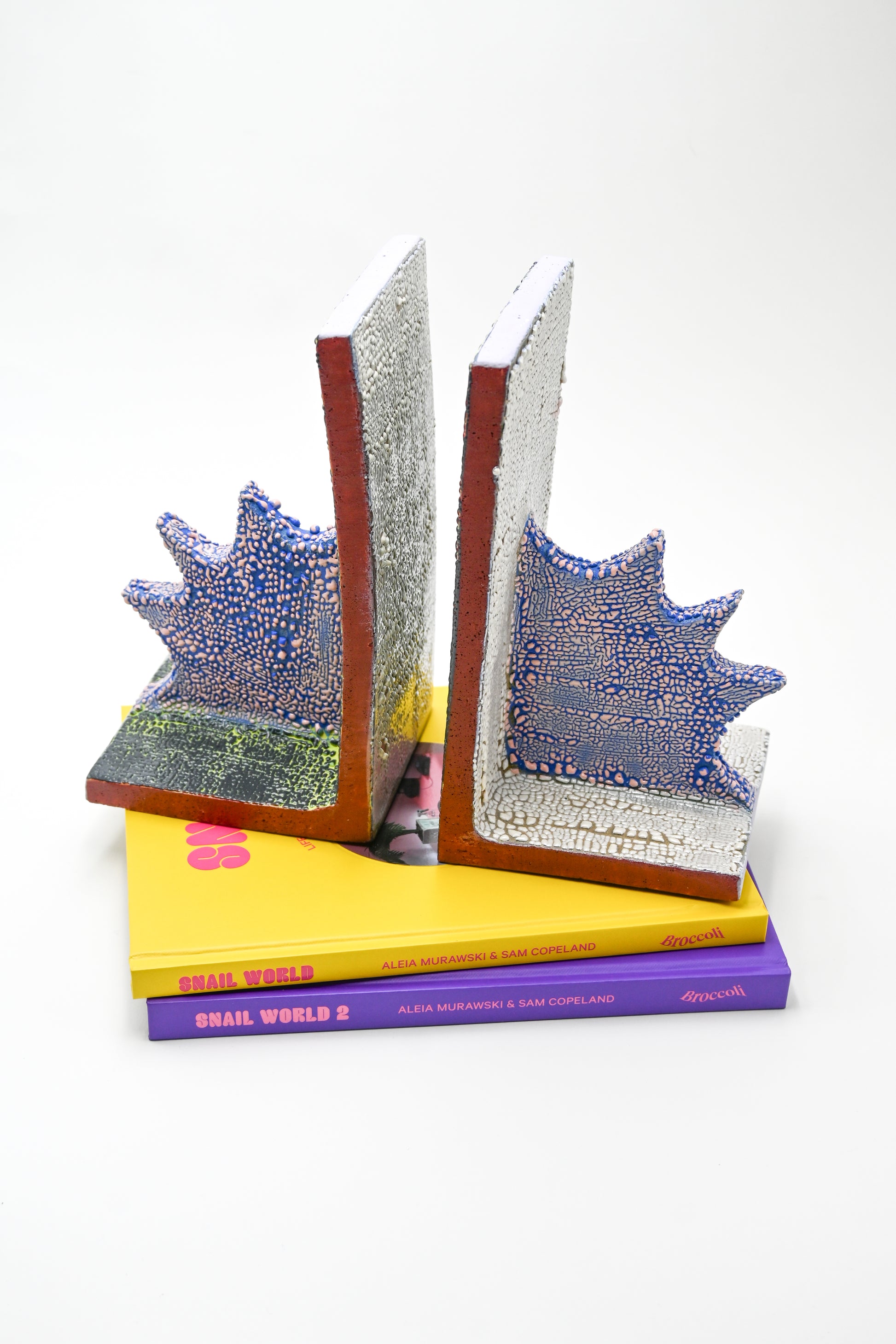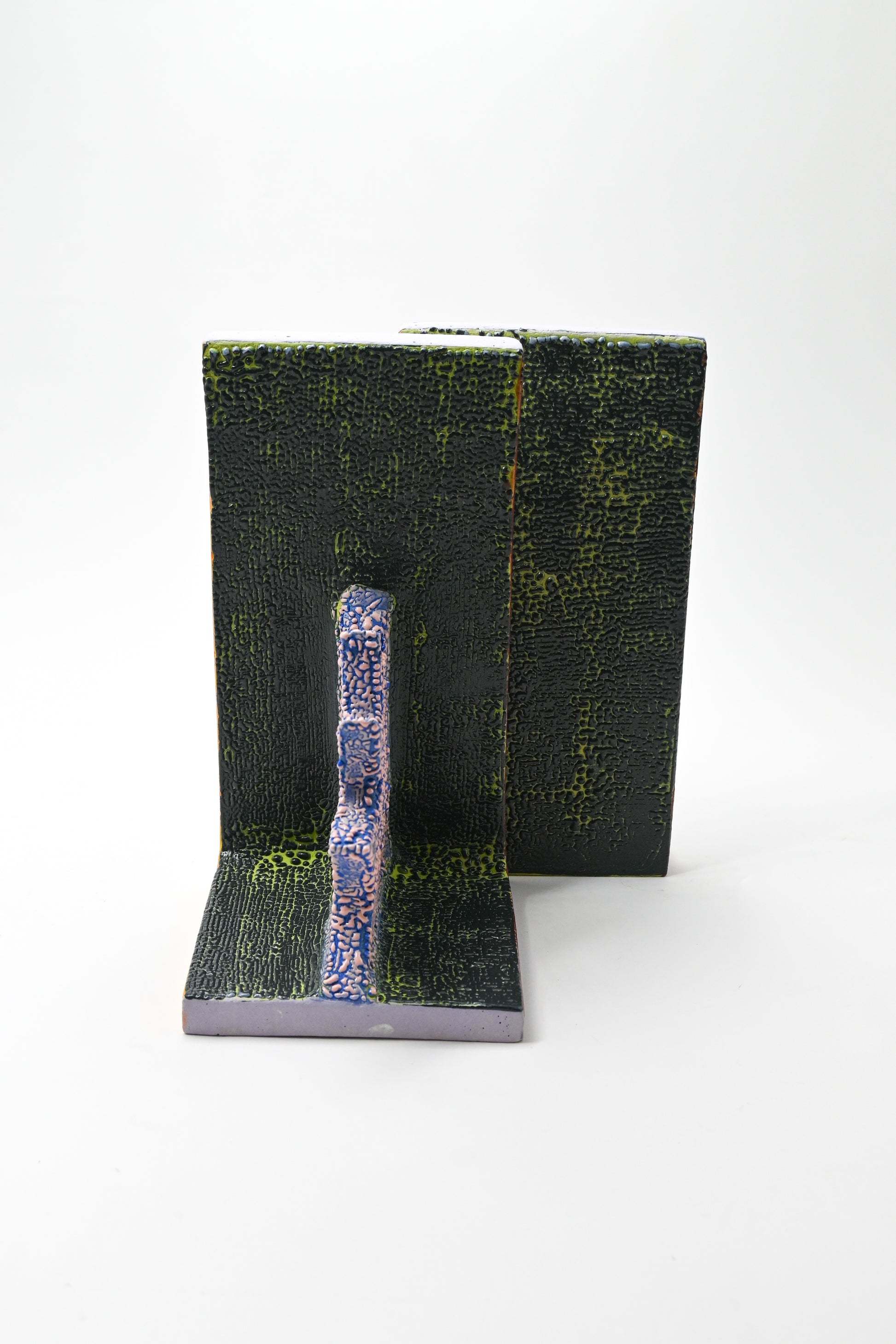 One of a kind set of sculpted stoneware bookends with hand painted glaze. Finished with mother of pearl luster.