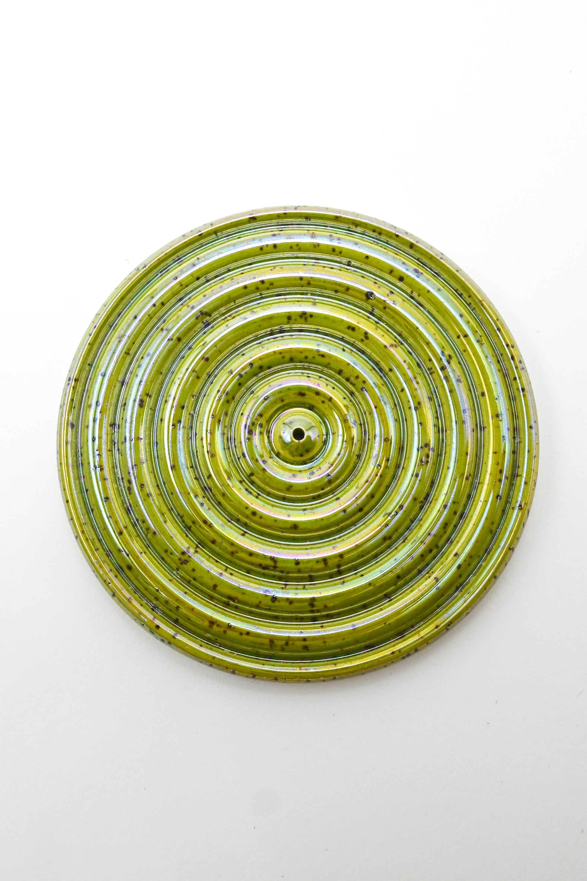 Handmade stoneware incense holder with hand painted glaze design. Finished with mother of pearl luster.
