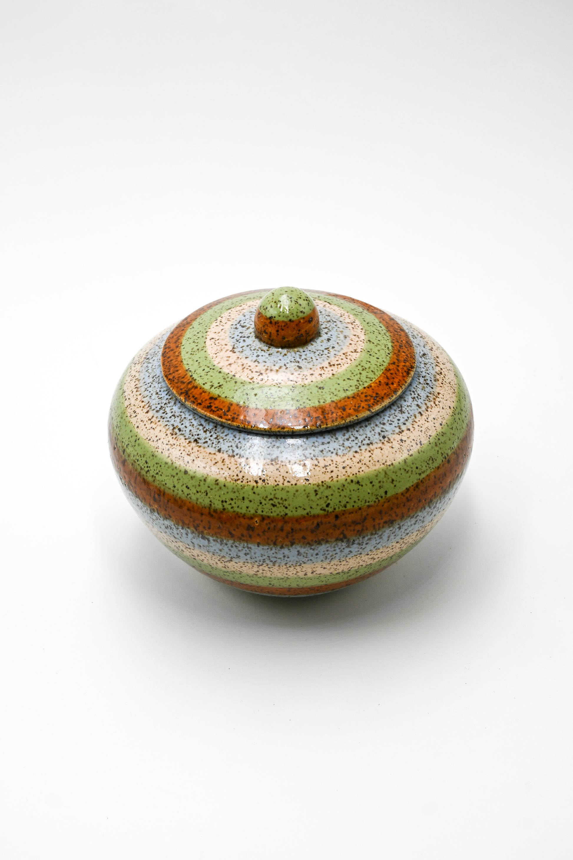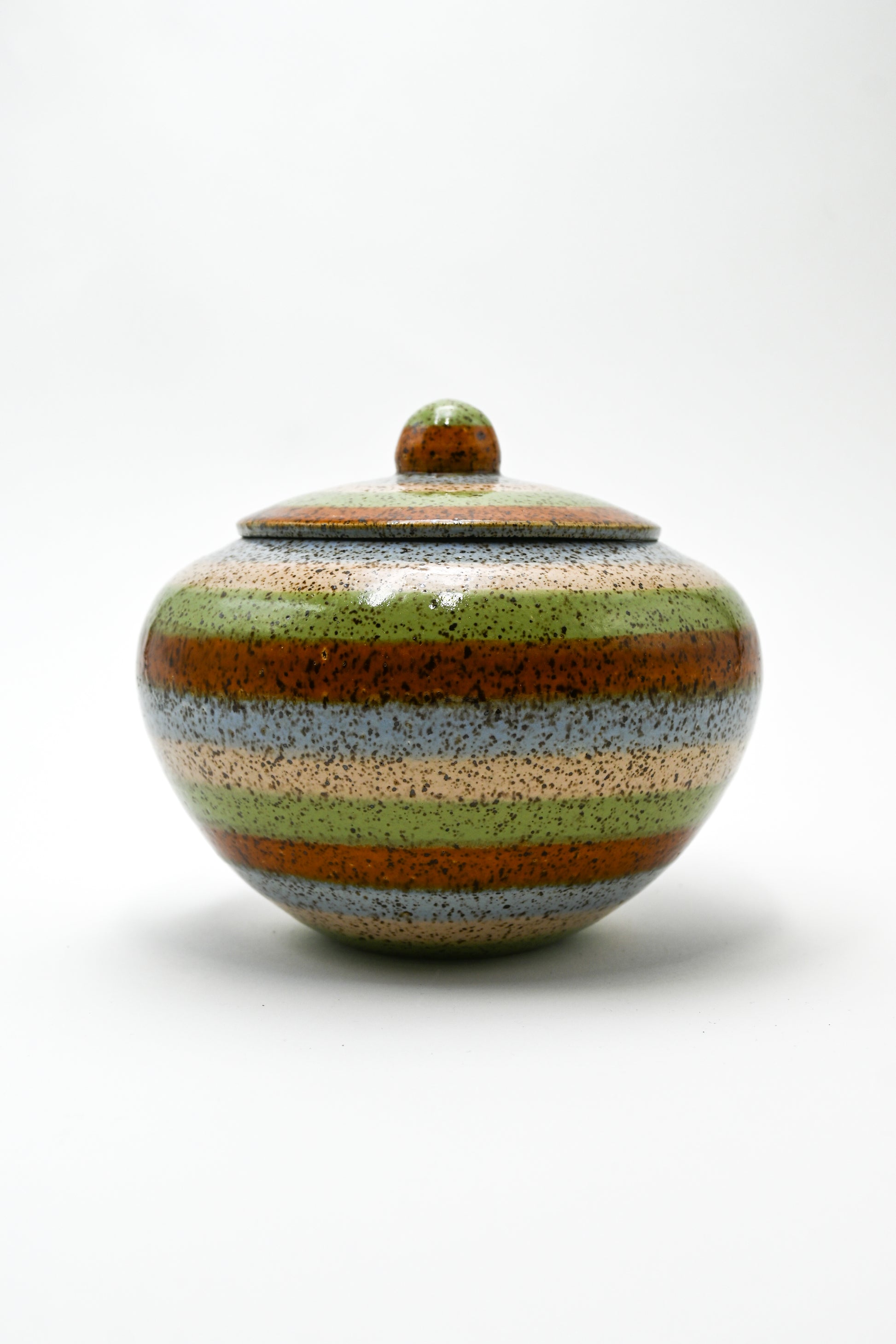 Wheel thrown stoneware lidded jar with hand painted glaze design. Food safe.