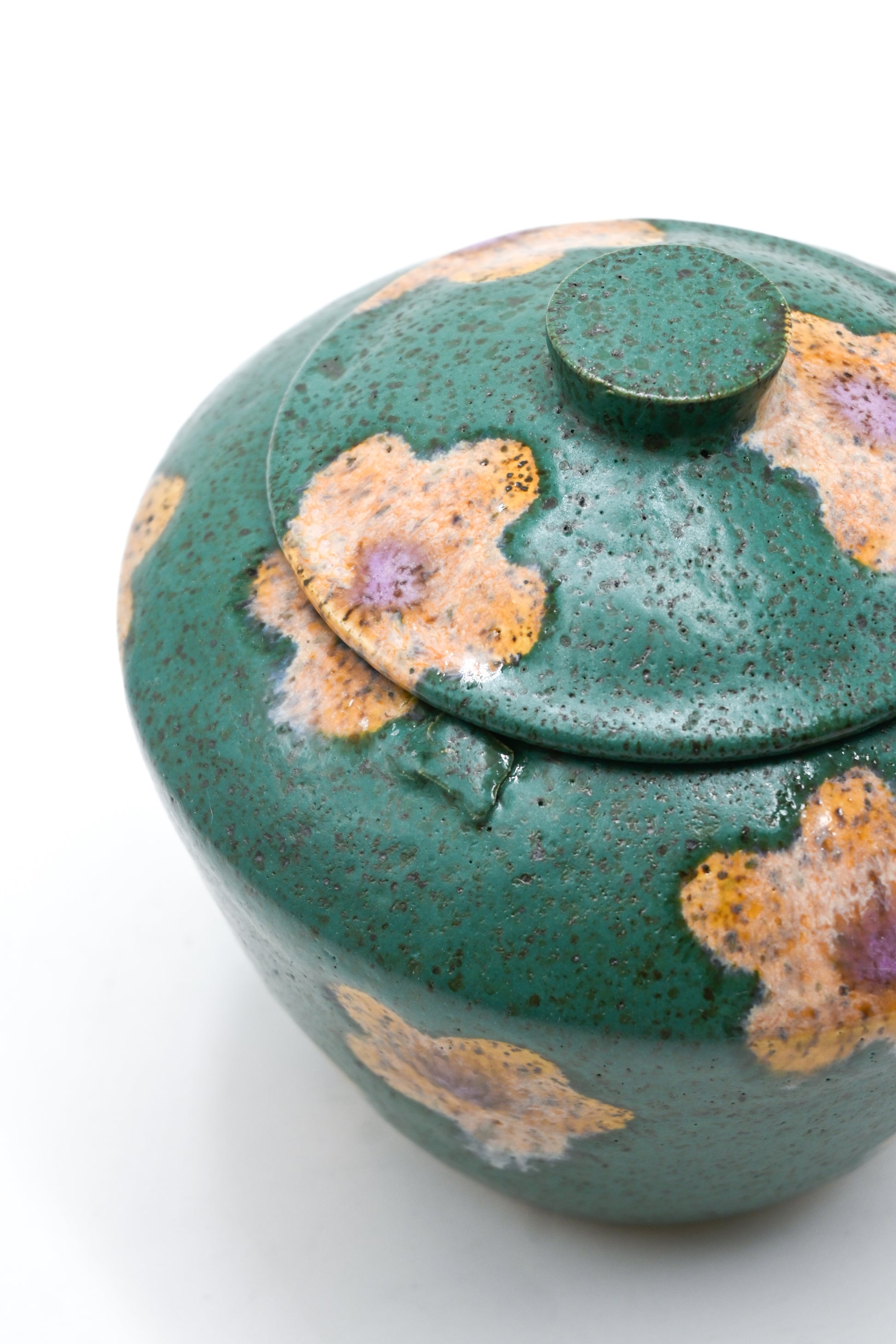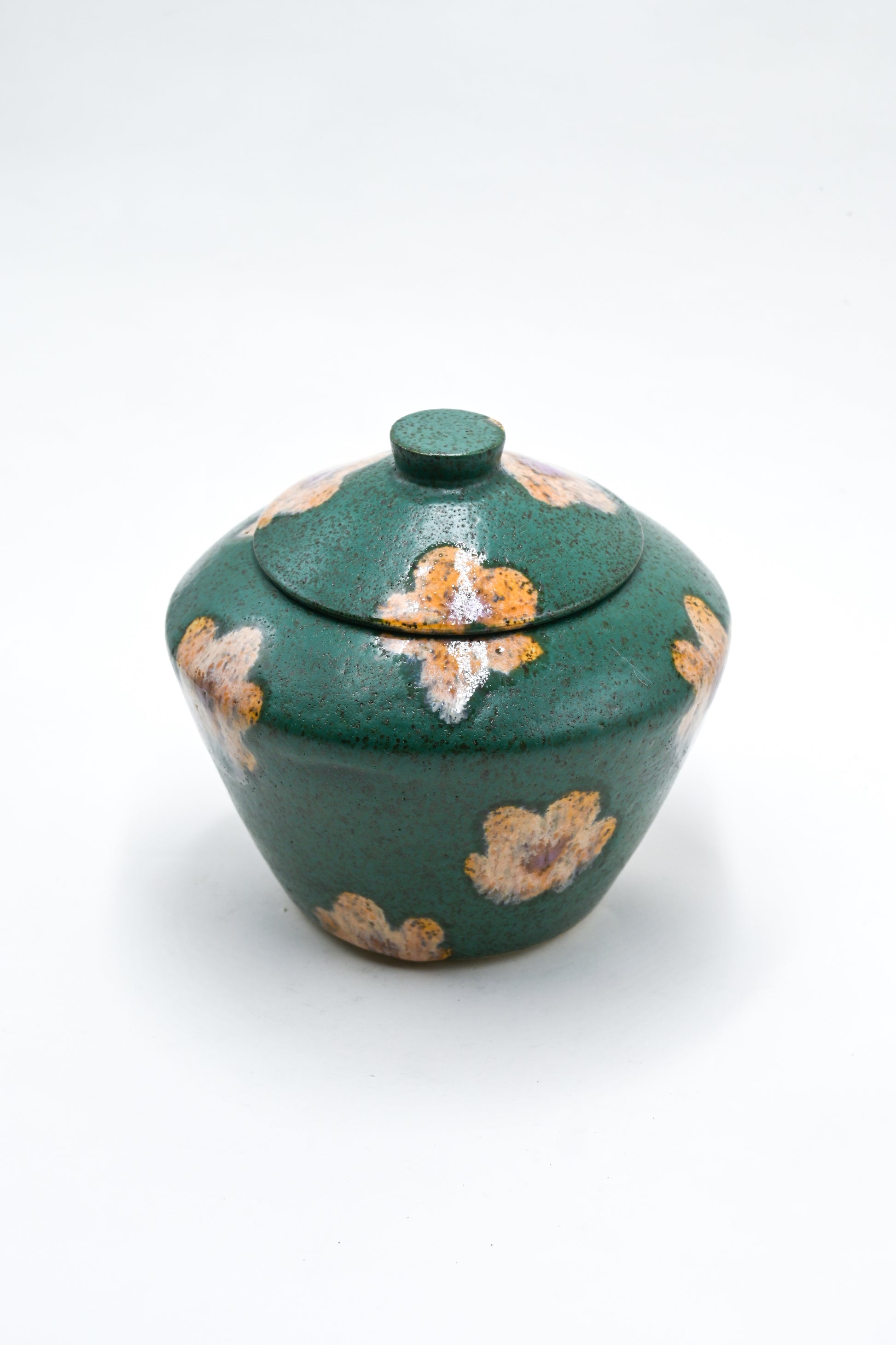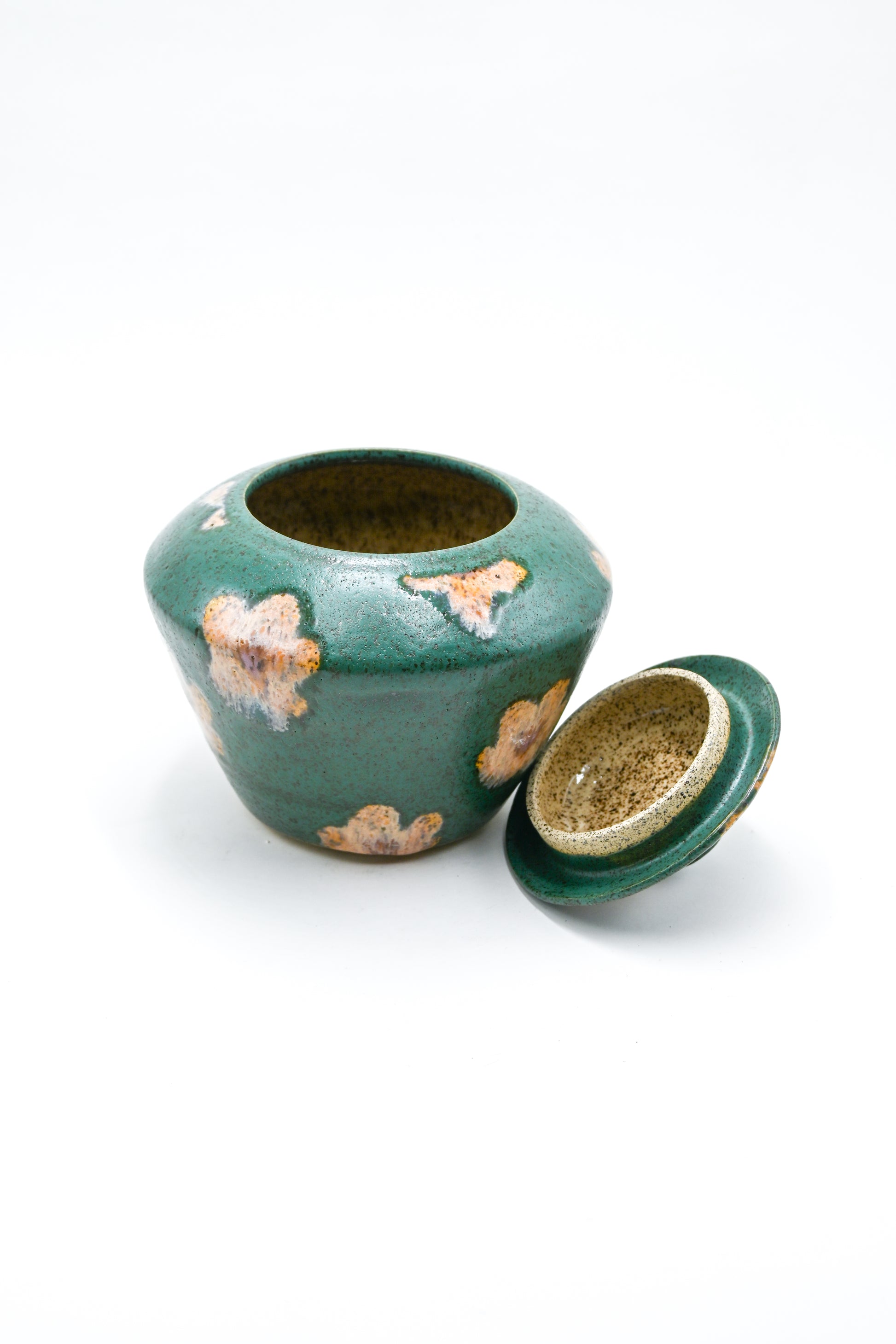 Wheel thrown stoneware lidded jar with hand painted glaze design. Food safe.
