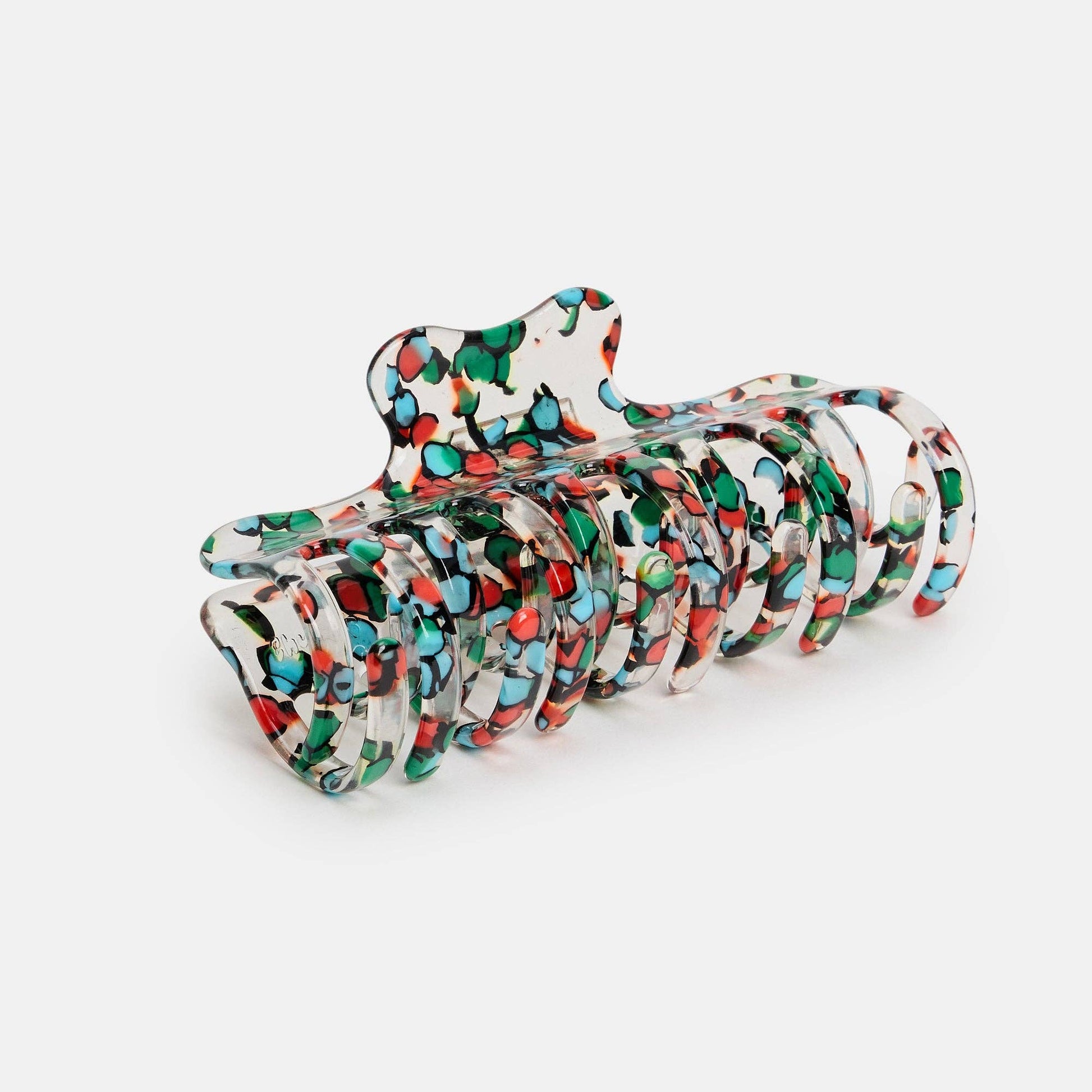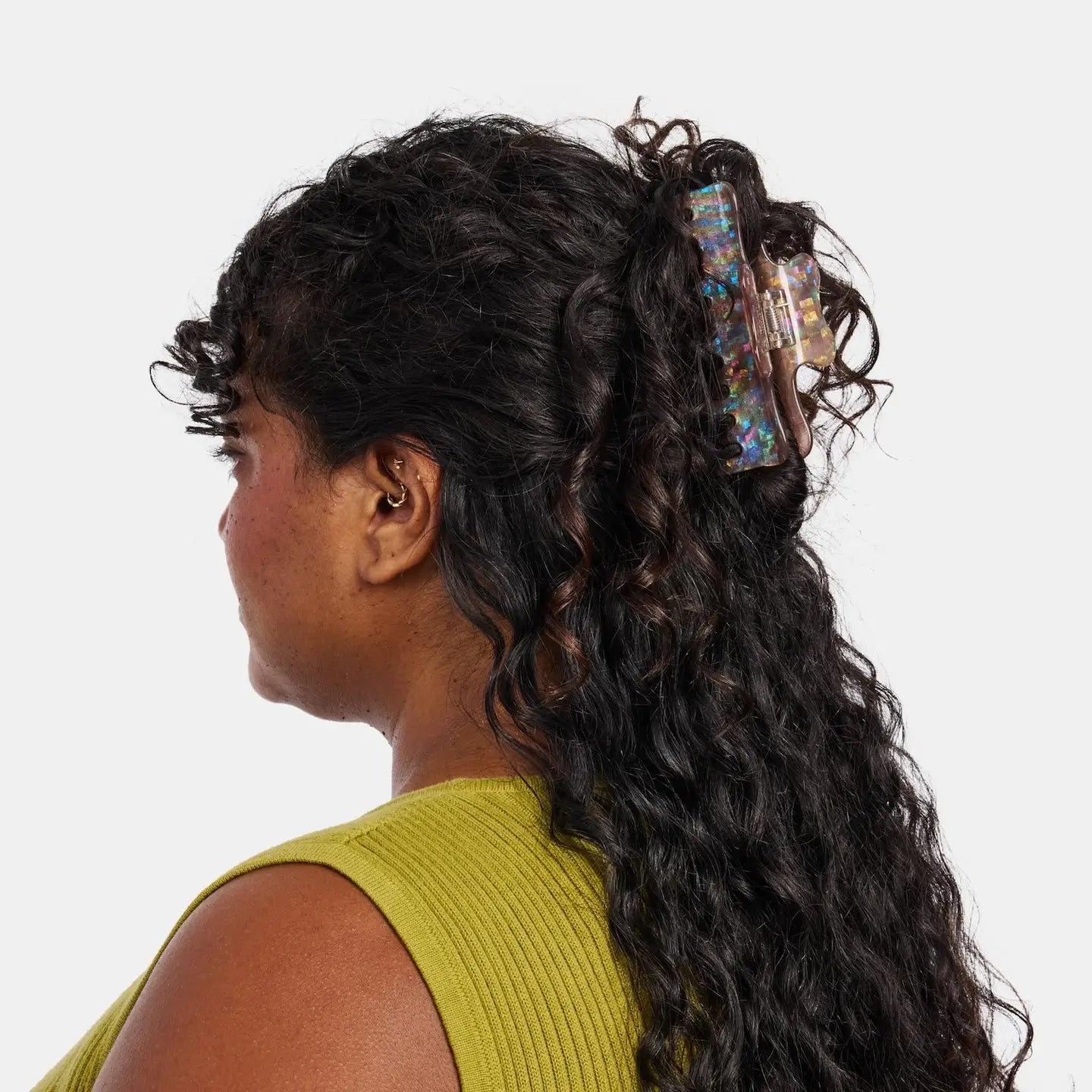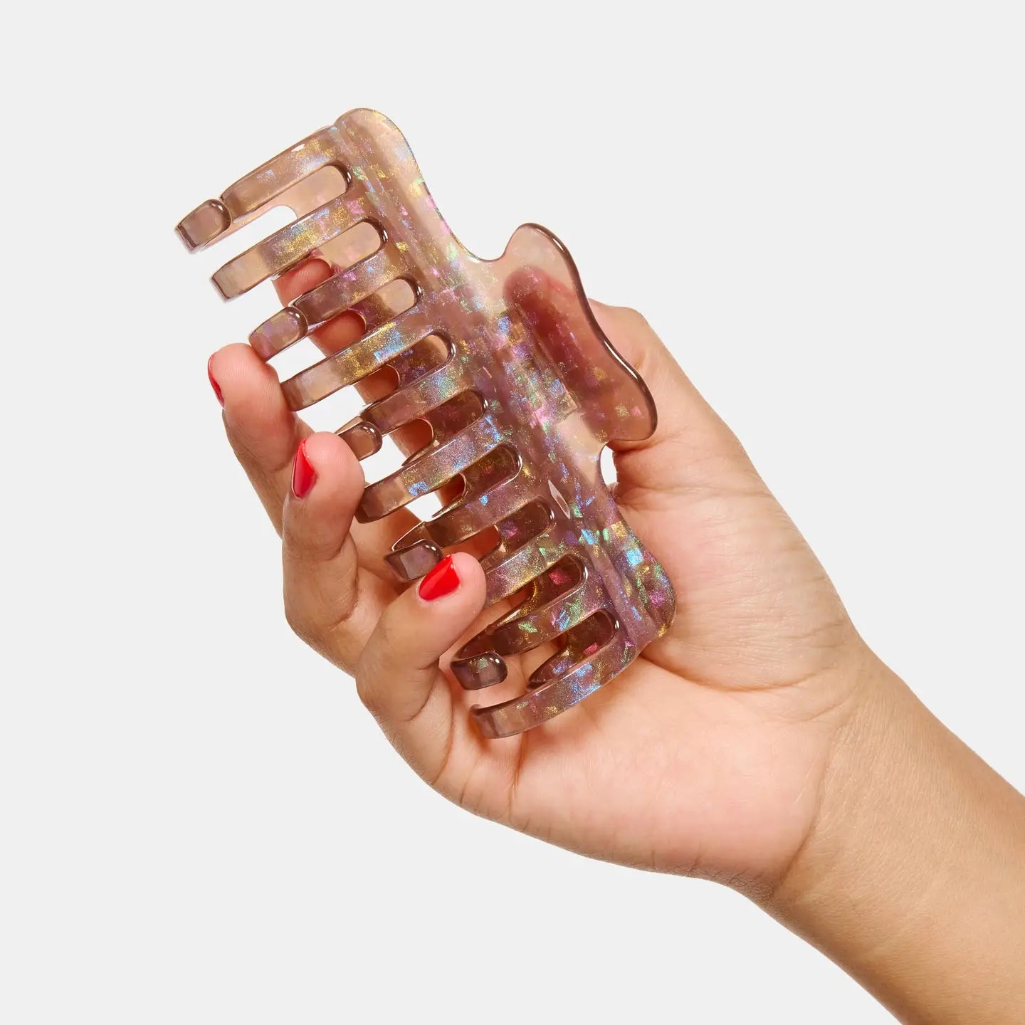 This claw has a double row of teeth for an extra secure hold. Works with all hair types and great for fine or slippery hair. Made from high quality acetate; a durable, plant based bio-plastic. Metal hardware is lead and nickel-free. Slight variations will appear with pattern, color and form due to the handmade nature of the product.