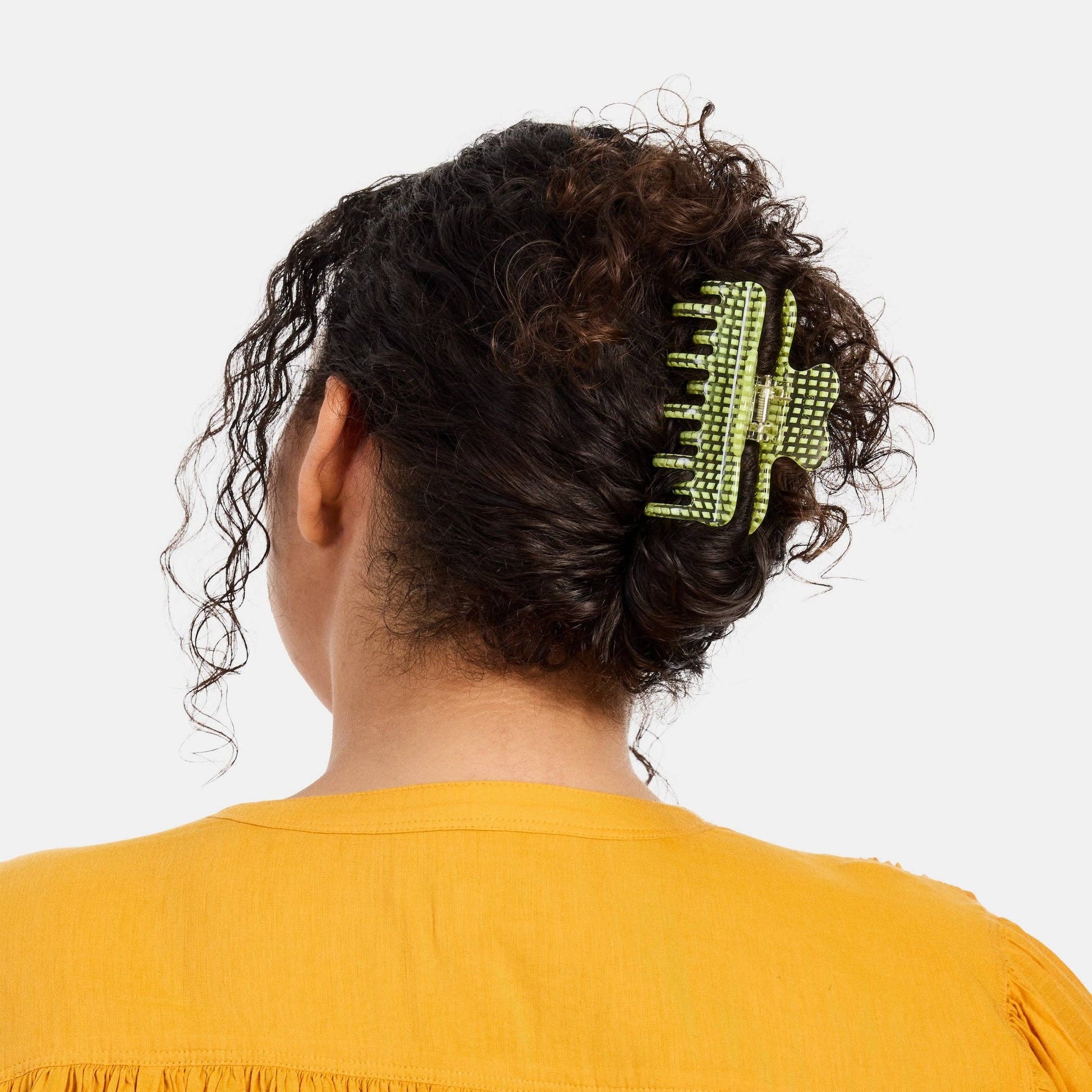 This claw has a double row of teeth for an extra secure hold. Works with all hair types and great for fine or slippery hair. Made from high quality acetate; a durable, plant based bio-plastic. Metal hardware is lead and nickel-free. Slight variations will appear with pattern, color and form due to the handmade nature of the product. Measures approx 3.34"L x 1.7" W x 1.96"D