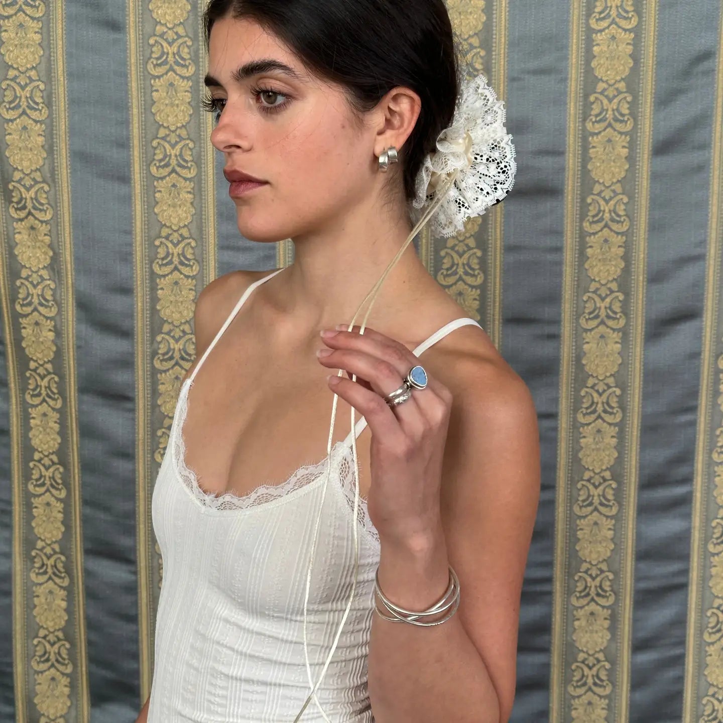 Lace trim stain ribbon peplum bun topper scrunchie with corded ties. Adorable popped right onto your bun or polytail, not meant to be twisted. Ties can be made into a bow or can hang untied. Measures 4" x 4". Made in Philadelphia, PA.