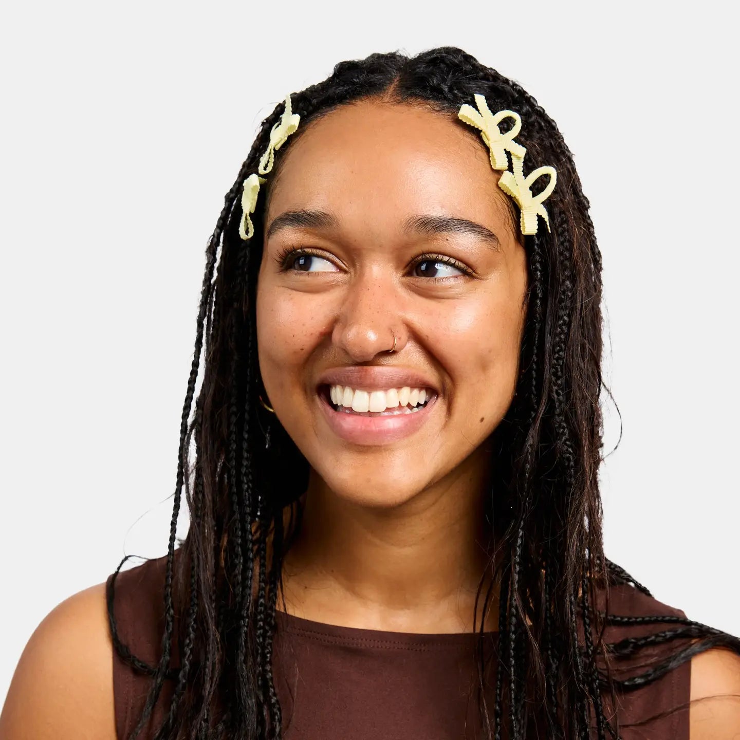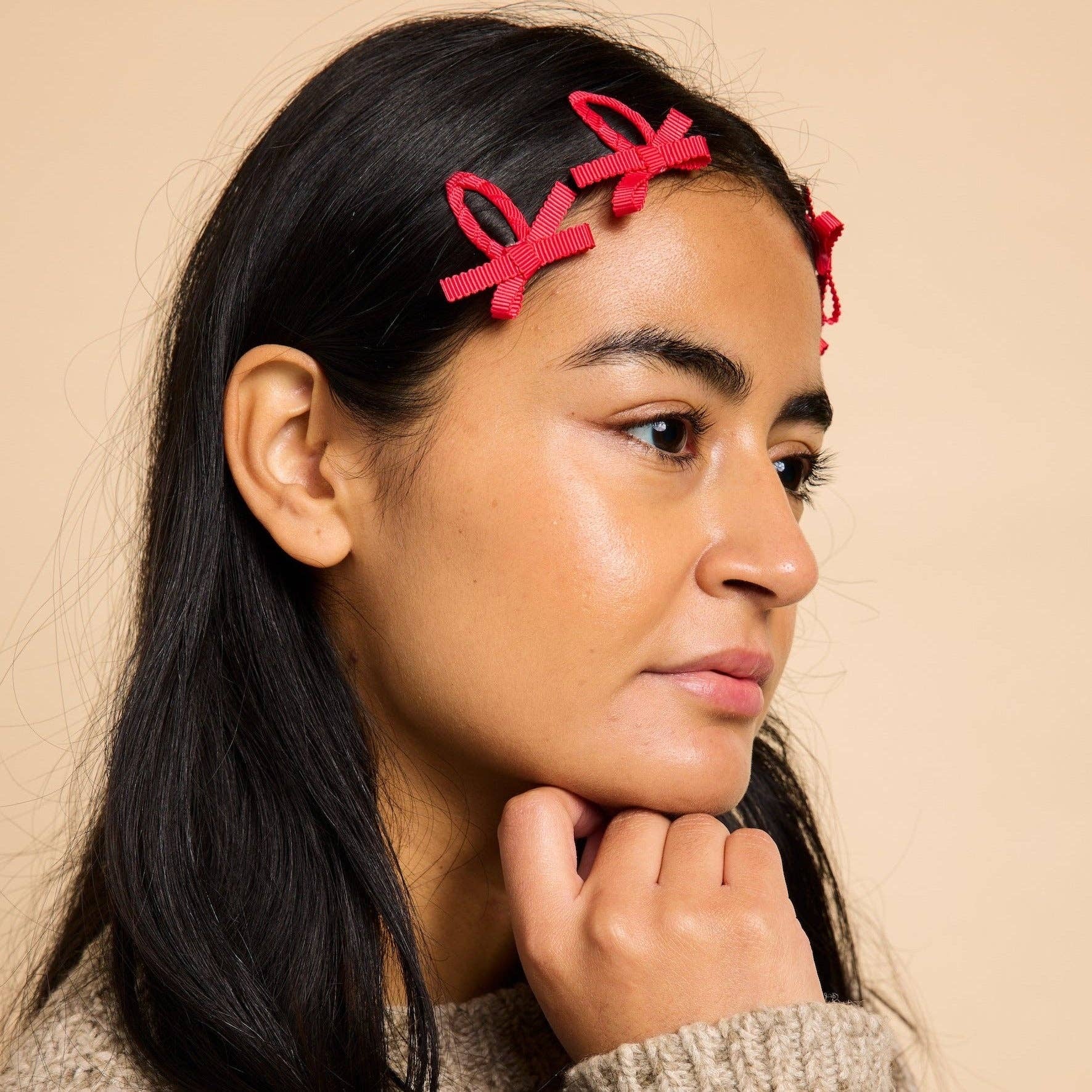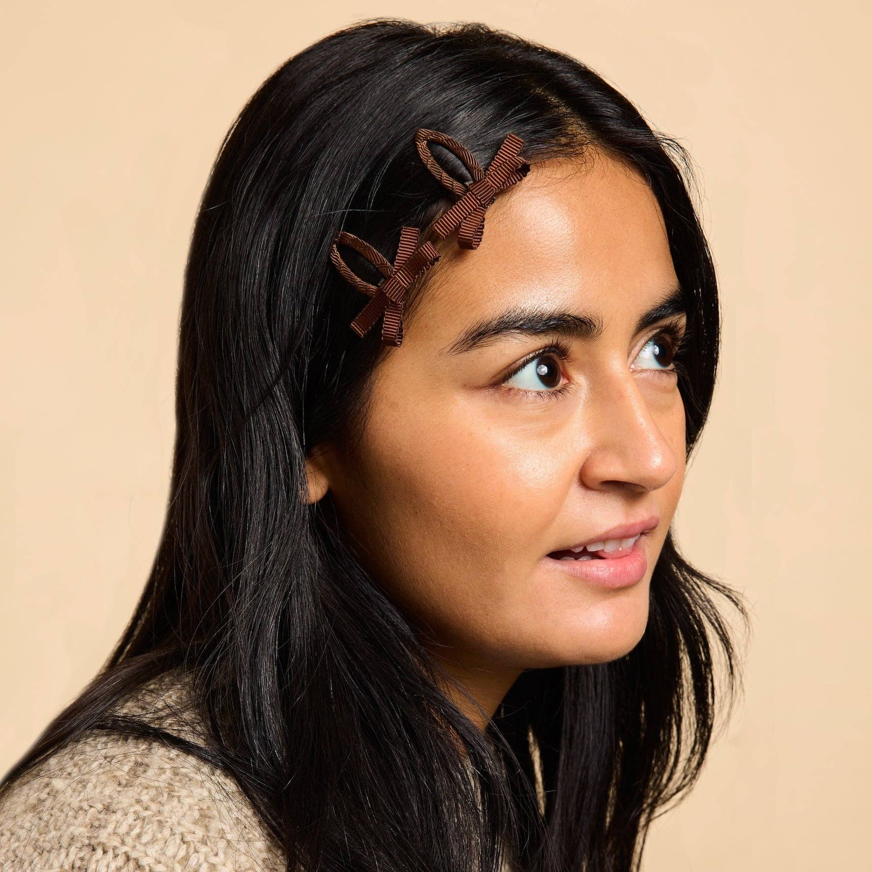 A pack of 4 sweet, mini metal snap clips, wrapped up in brown ribbon. Perfect to decorate all types of hair.