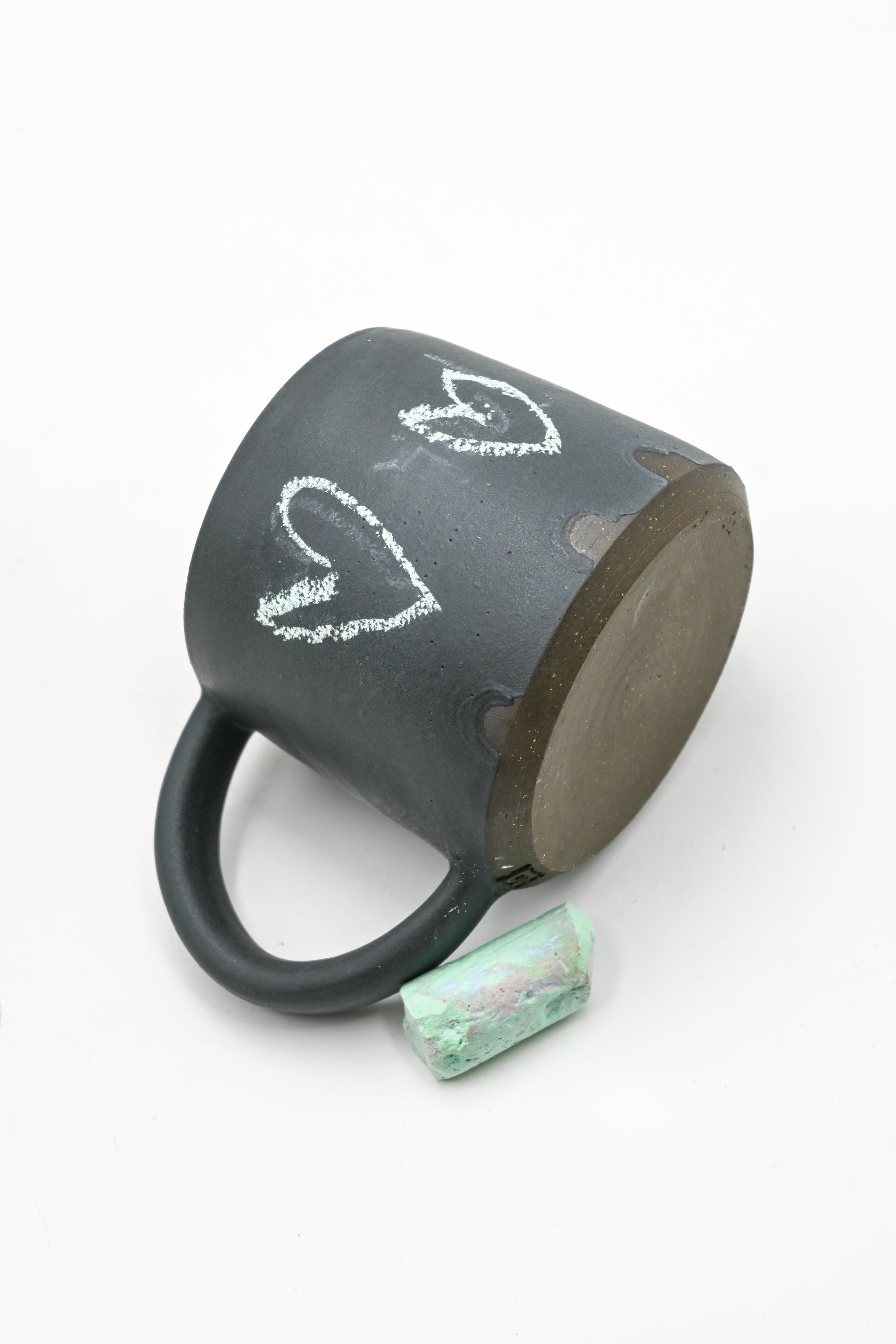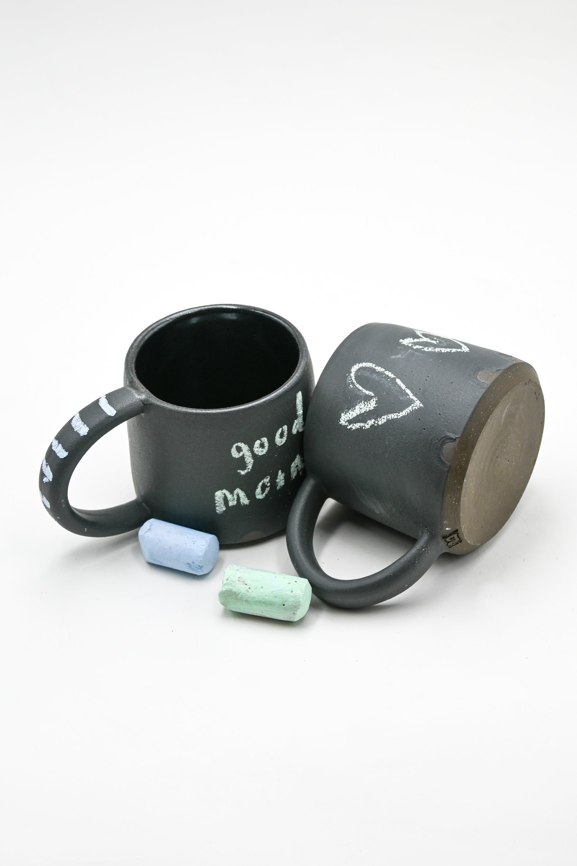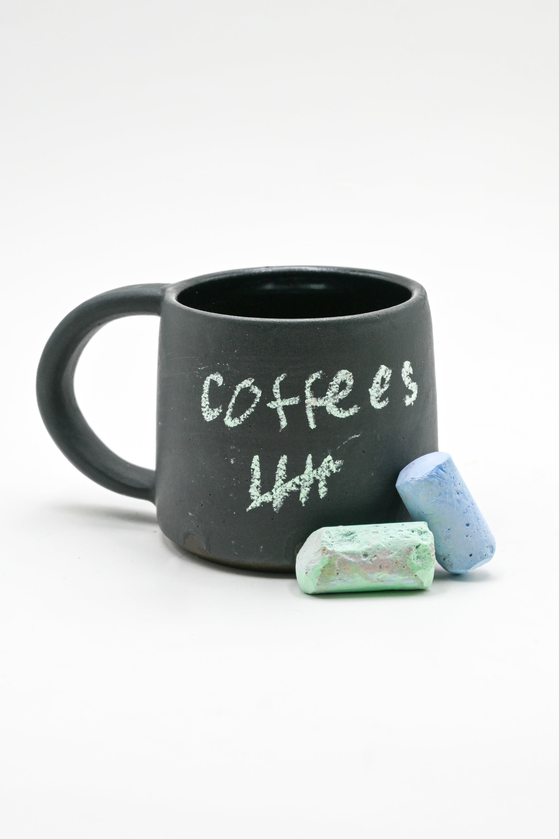 Wheel thrown stoneware mug with hand painted glaze design. Food safe chalkboard glaze is erasable.