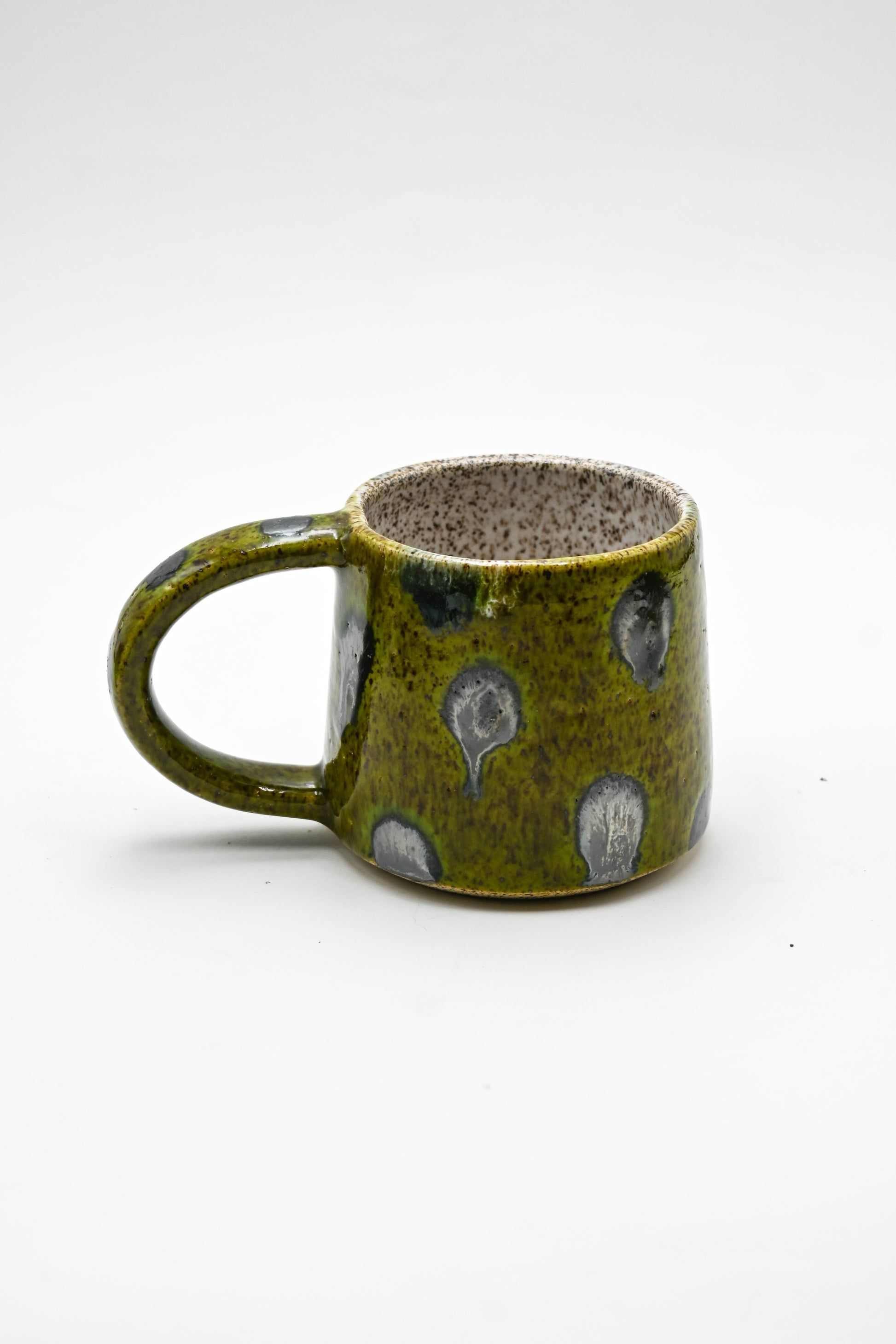 Wheel thrown stoneware mug with hand painted glaze design. Food safe.