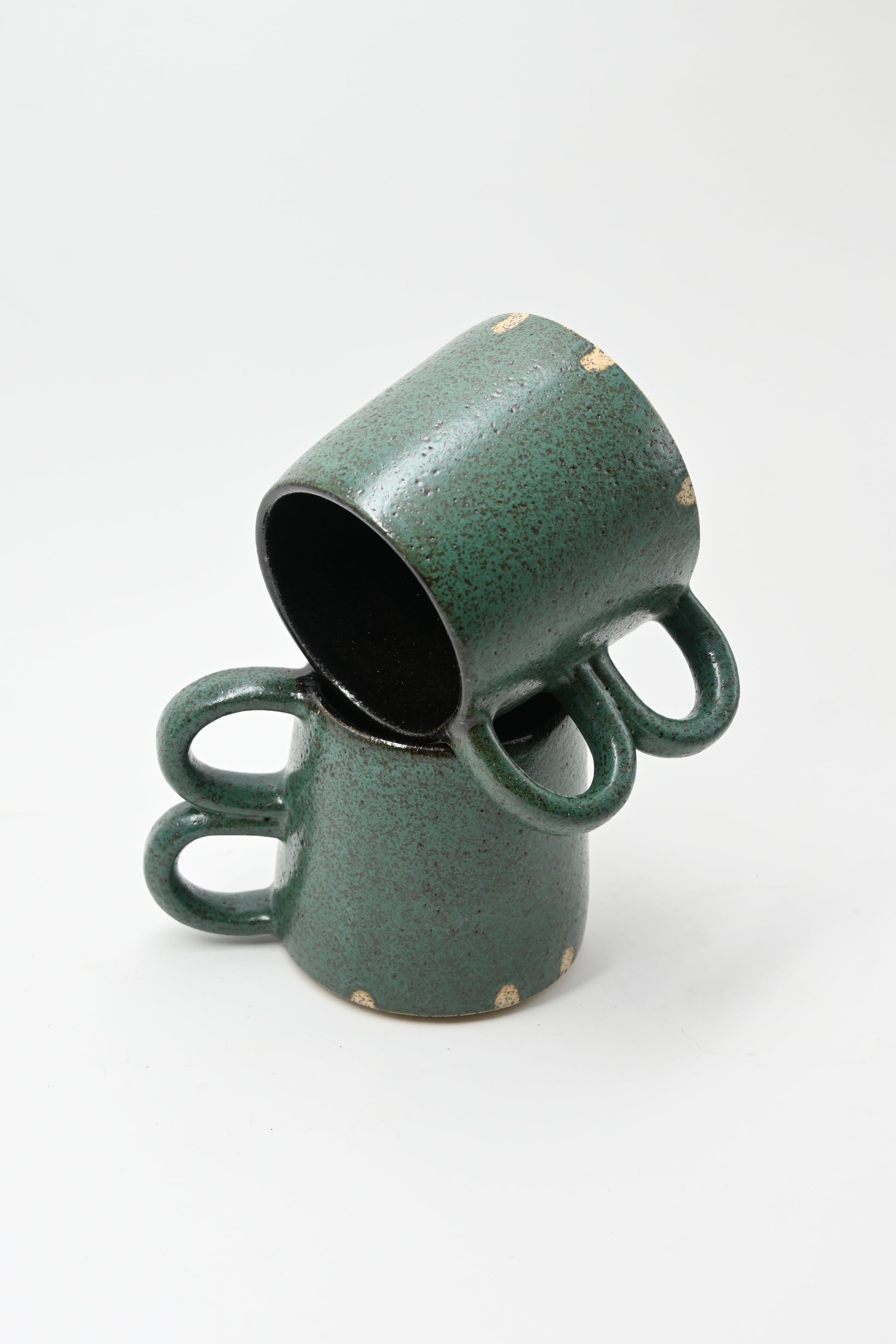 Wheel thrown stoneware mug with hand painted glaze design. Food safe.