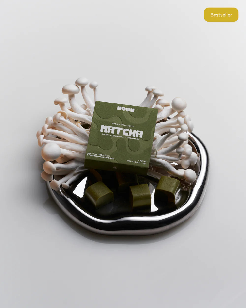 Functional Mushroom Matcha Chocolate made for playful energy, lifted good mood and lasting focus. Made with a proprietary Mushroom Superblend packed with the benefits of Reishi and adaptogens to help boost clarity and keep your mind and body feeling energized. No jitters, no cliffs.