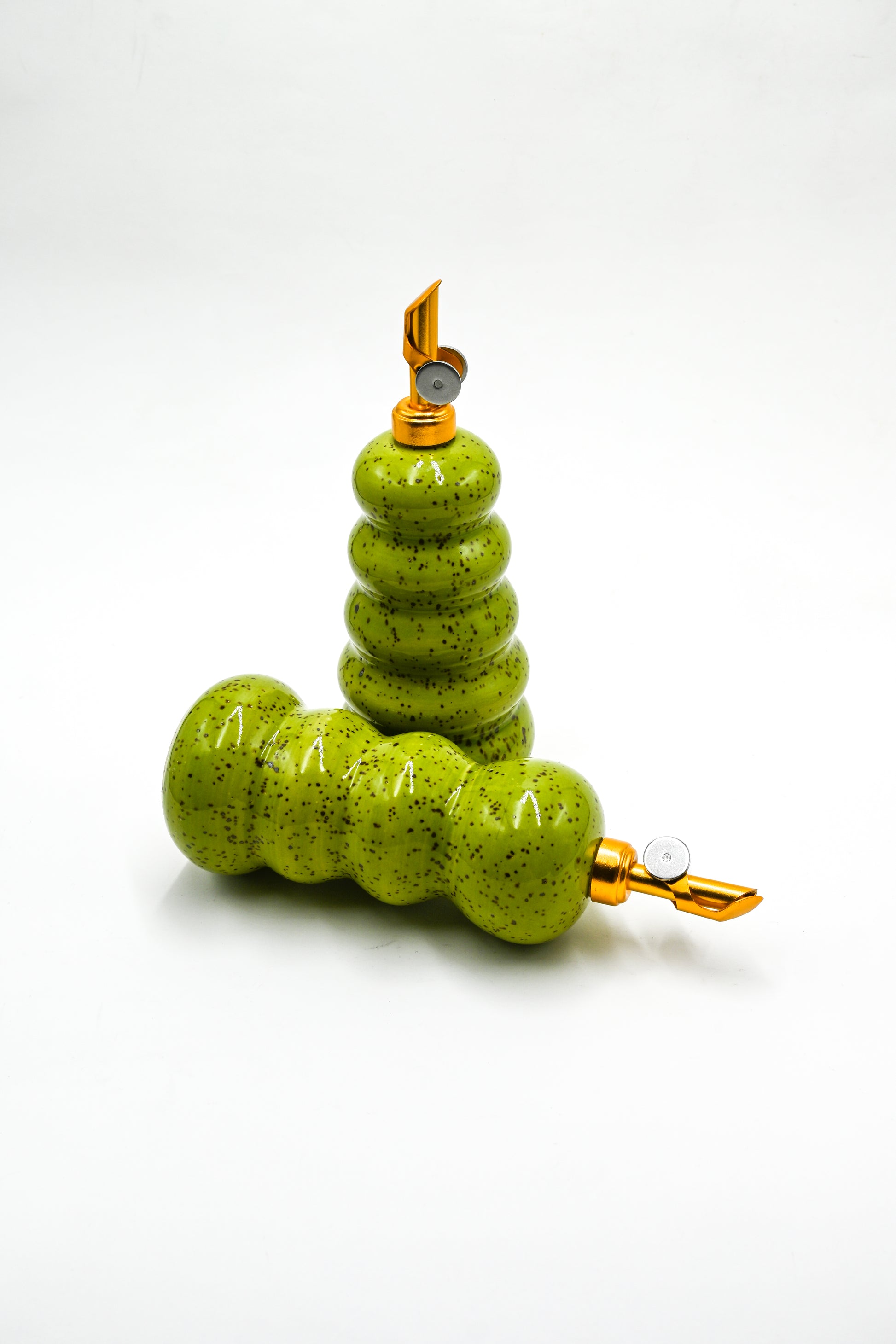 Wheel thrown stoneware oil dispenser with hand painted glaze design. Oil pour top included, this vessel can also be used as a small vase!