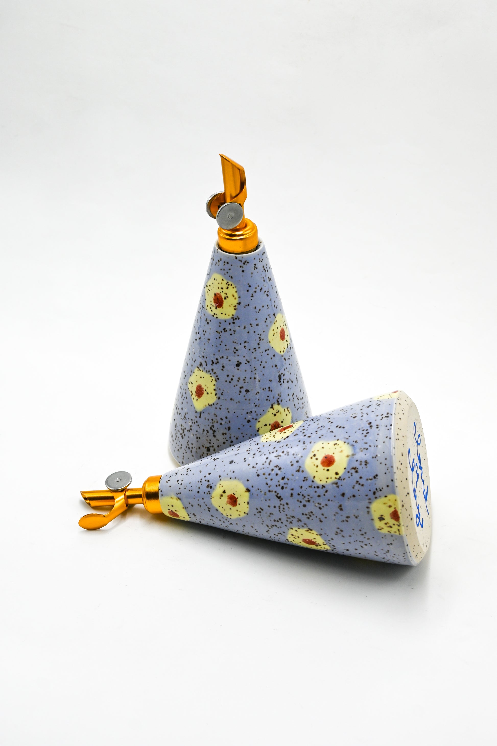 Wheel thrown stoneware oil dispenser with hand painted glaze design. Oil pour top included, this vessel can also be used as a small vase!