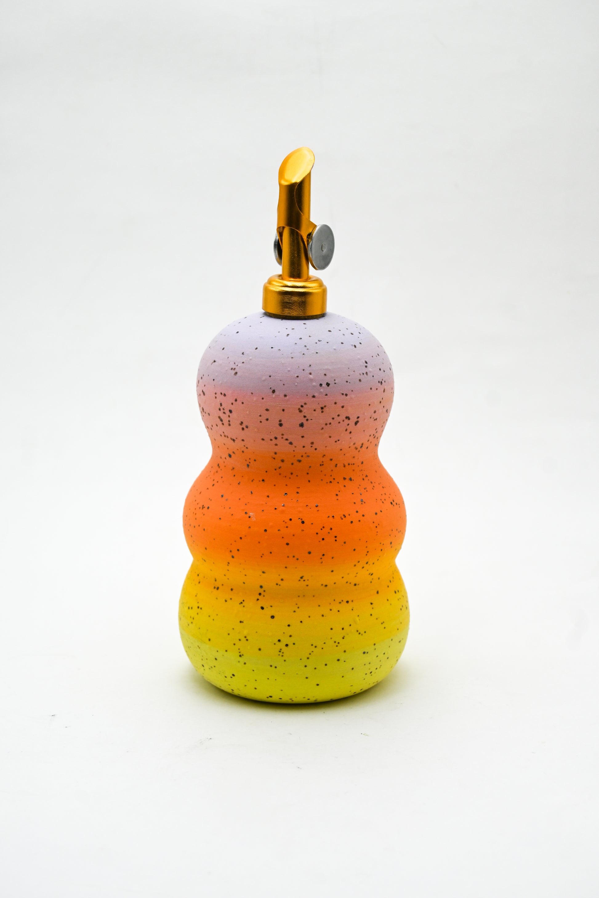 Wheel thrown stoneware oil dispenser with hand painted glaze design. Oil pour top included, this vessel can also be used as a small vase!