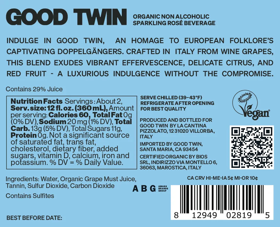 Good Twin is an organic non-alcoholic sparkling wine made in Italy with real Glera grapes (the same that are in Prosecco!). We designed this product to be a guilt free alternative to a traditional wine or cocktail. Without any alcohol or harmful additives, Good Twin is the perfect indulgence. Certified Organic & Vegan, made with only 4 ingredients.