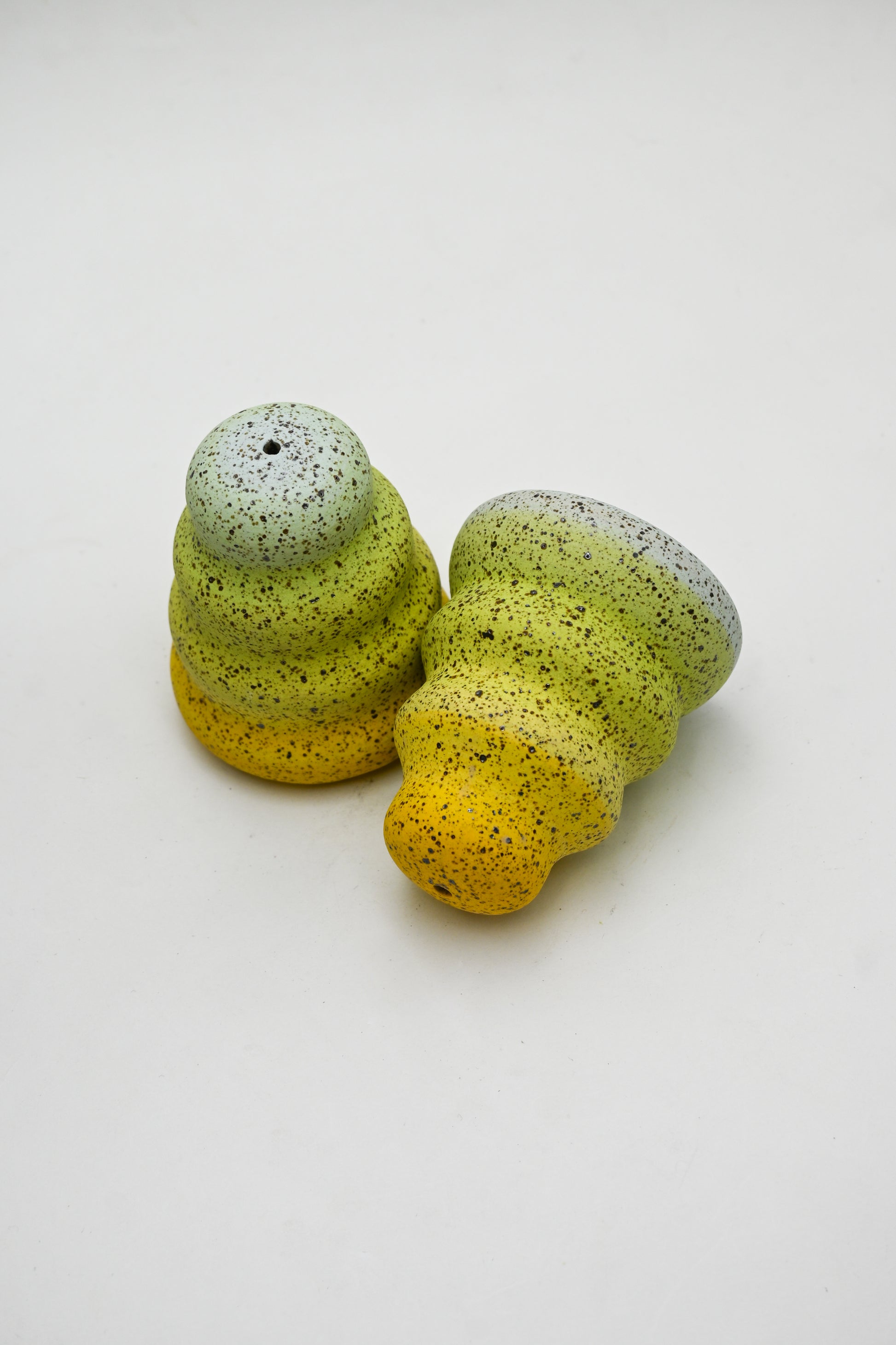 Wheel thrown stoneware salt and pepper shaker set with hand painted glaze design. Food safe.
