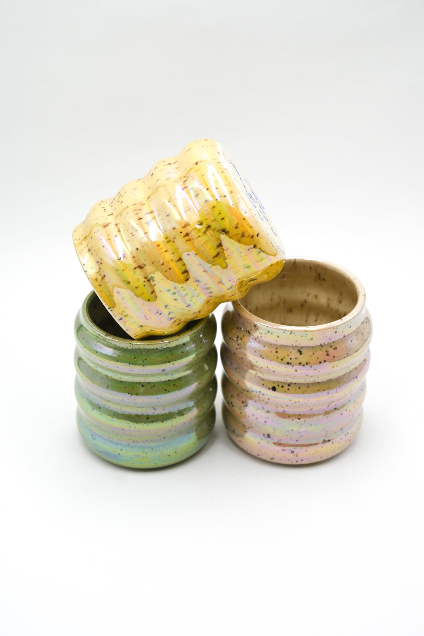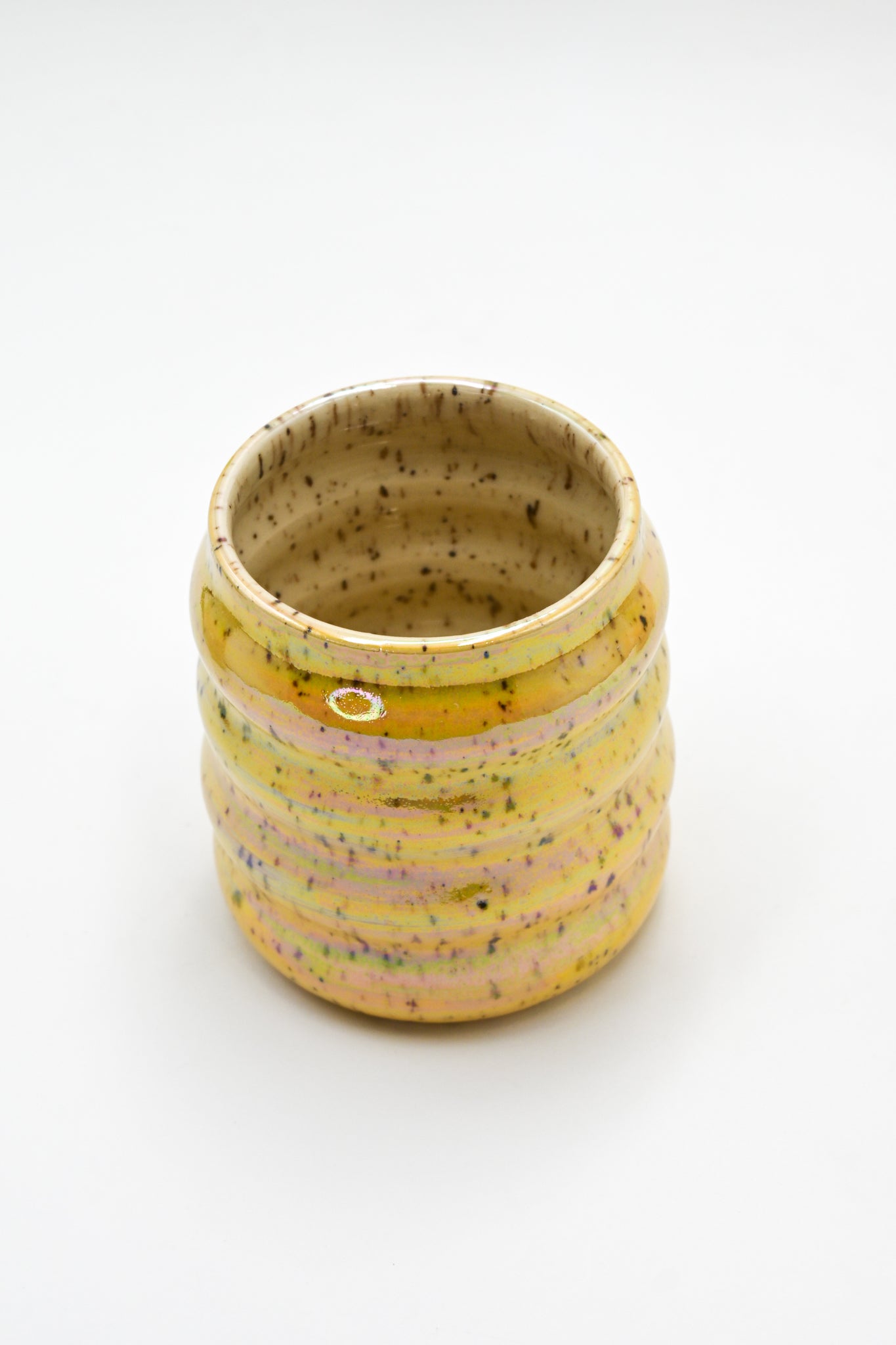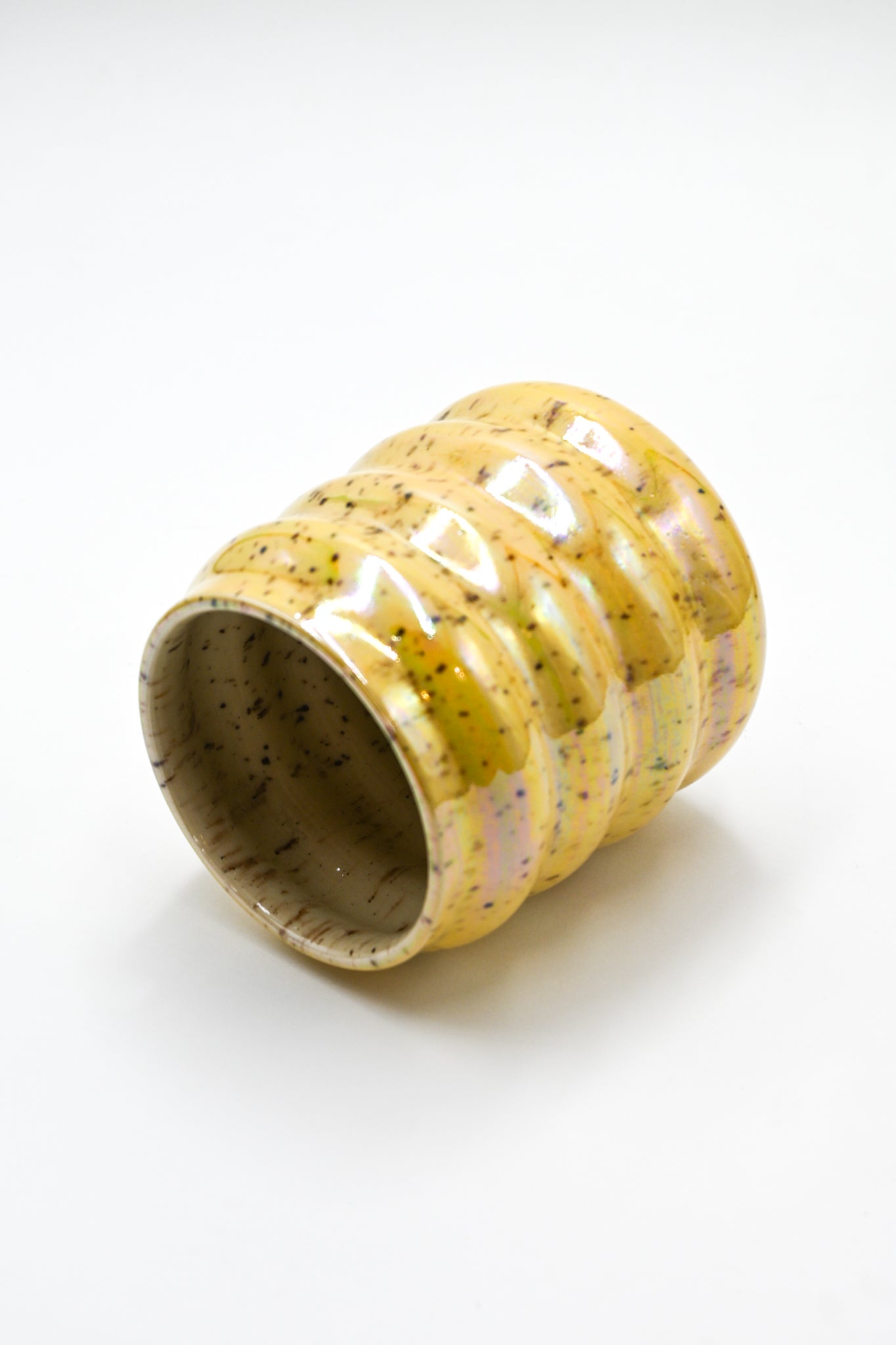 Wheel thrown stoneware smoothie cup with hand painted glaze design. Finished with a luster overglaze, do NOT microwave