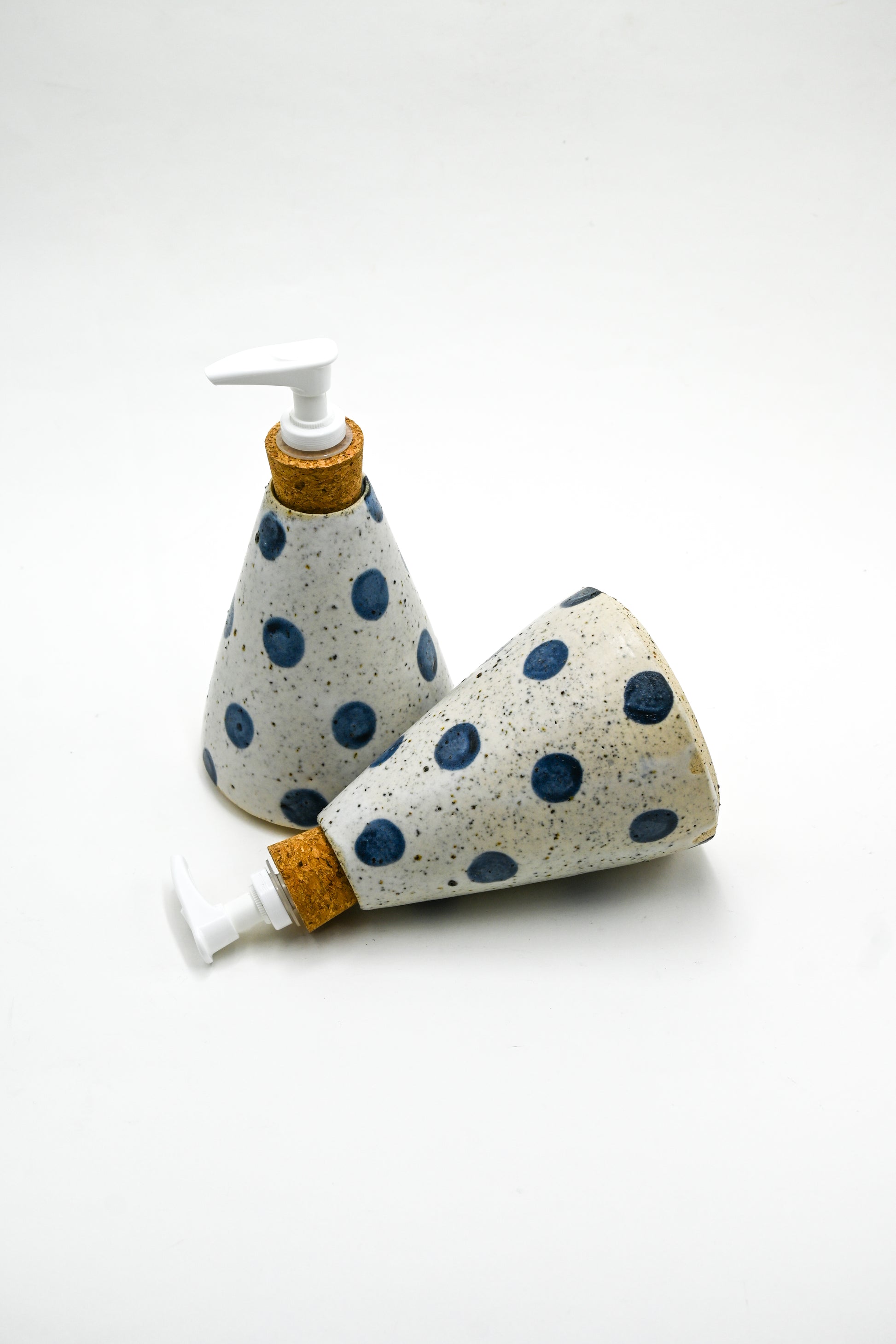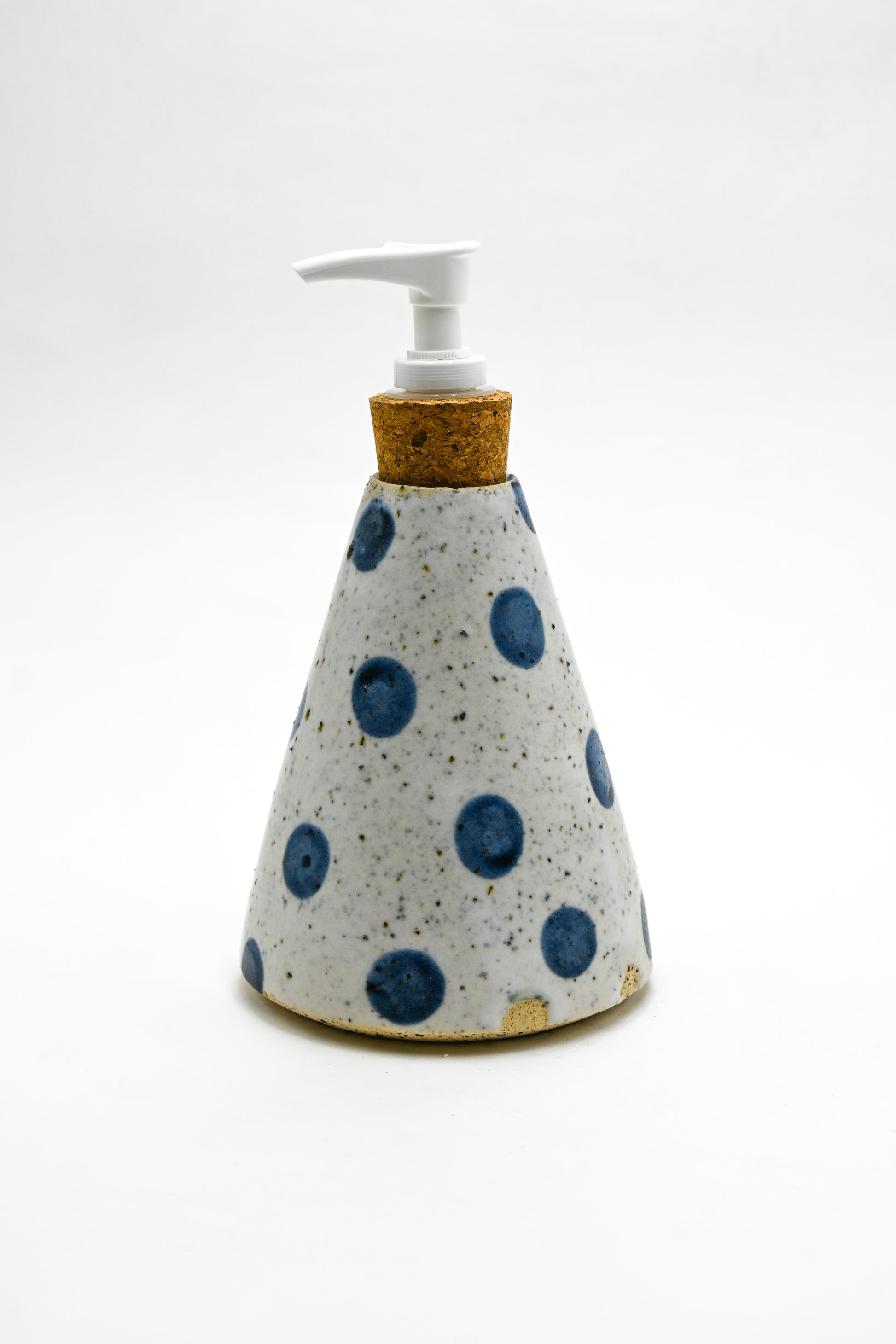 Wheel thrown blue porcelain liquid soap dispenser with hand painted glaze.