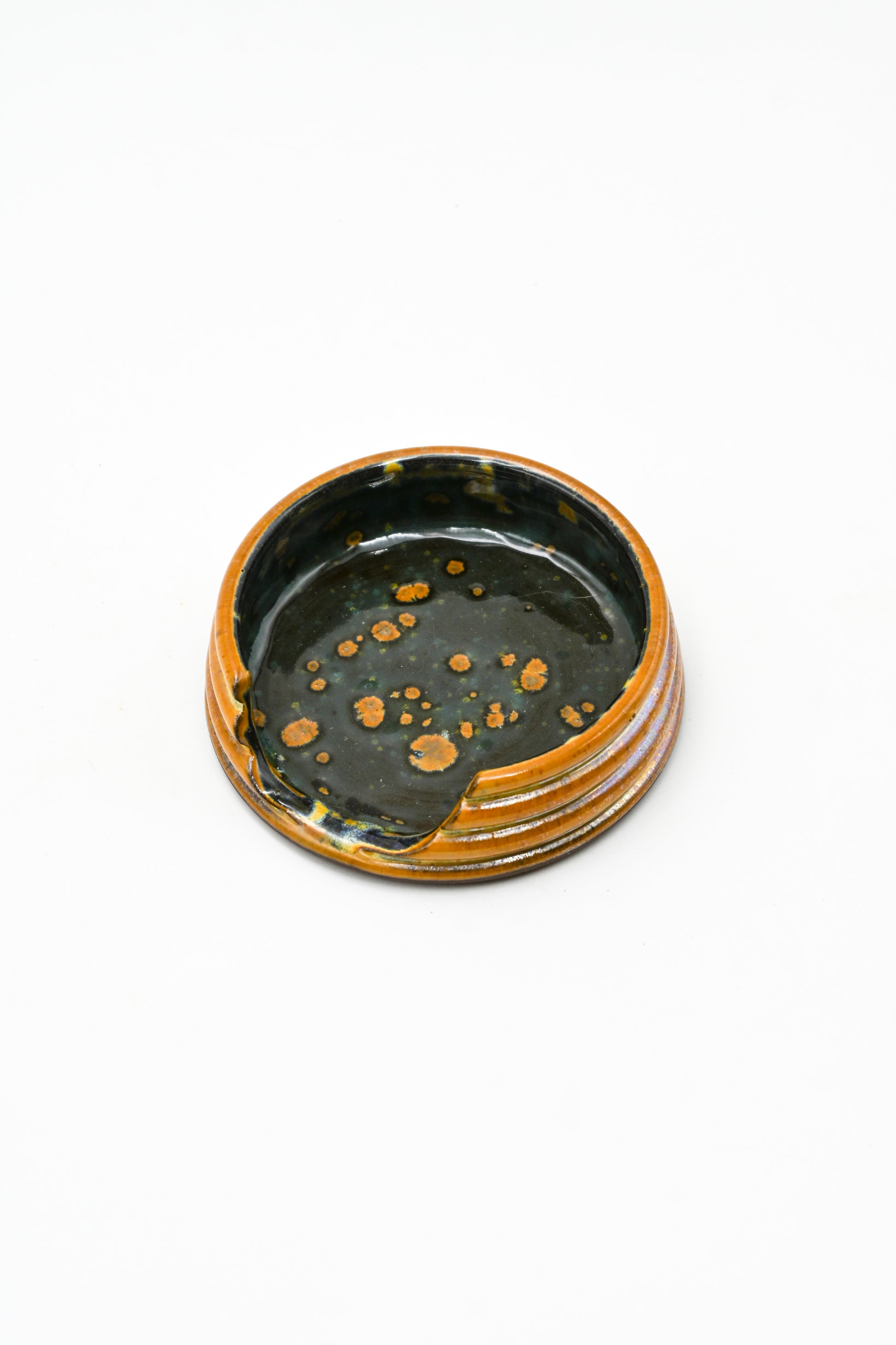 Wheel thrown stoneware spoon rest with hand painted glaze design.