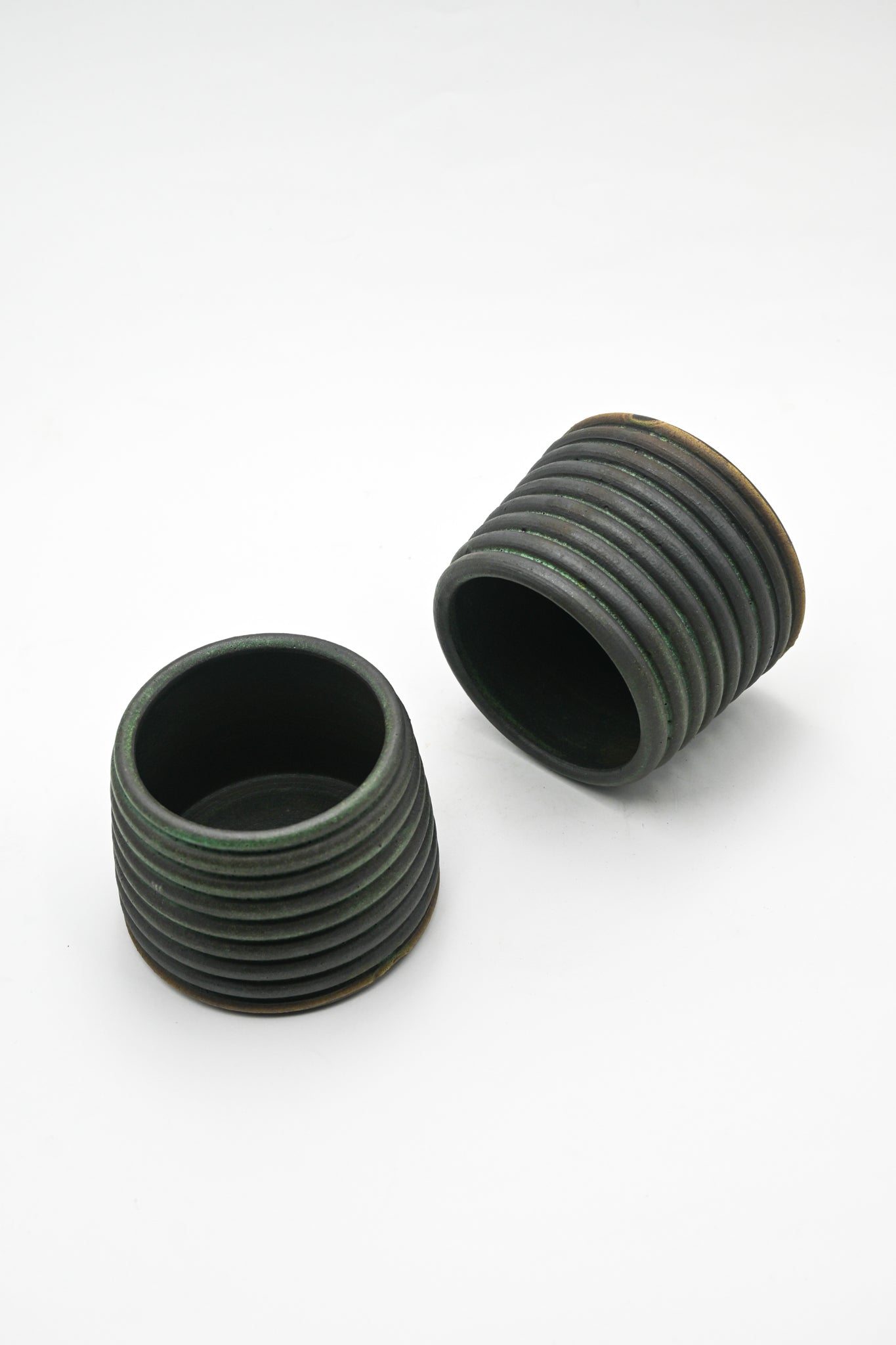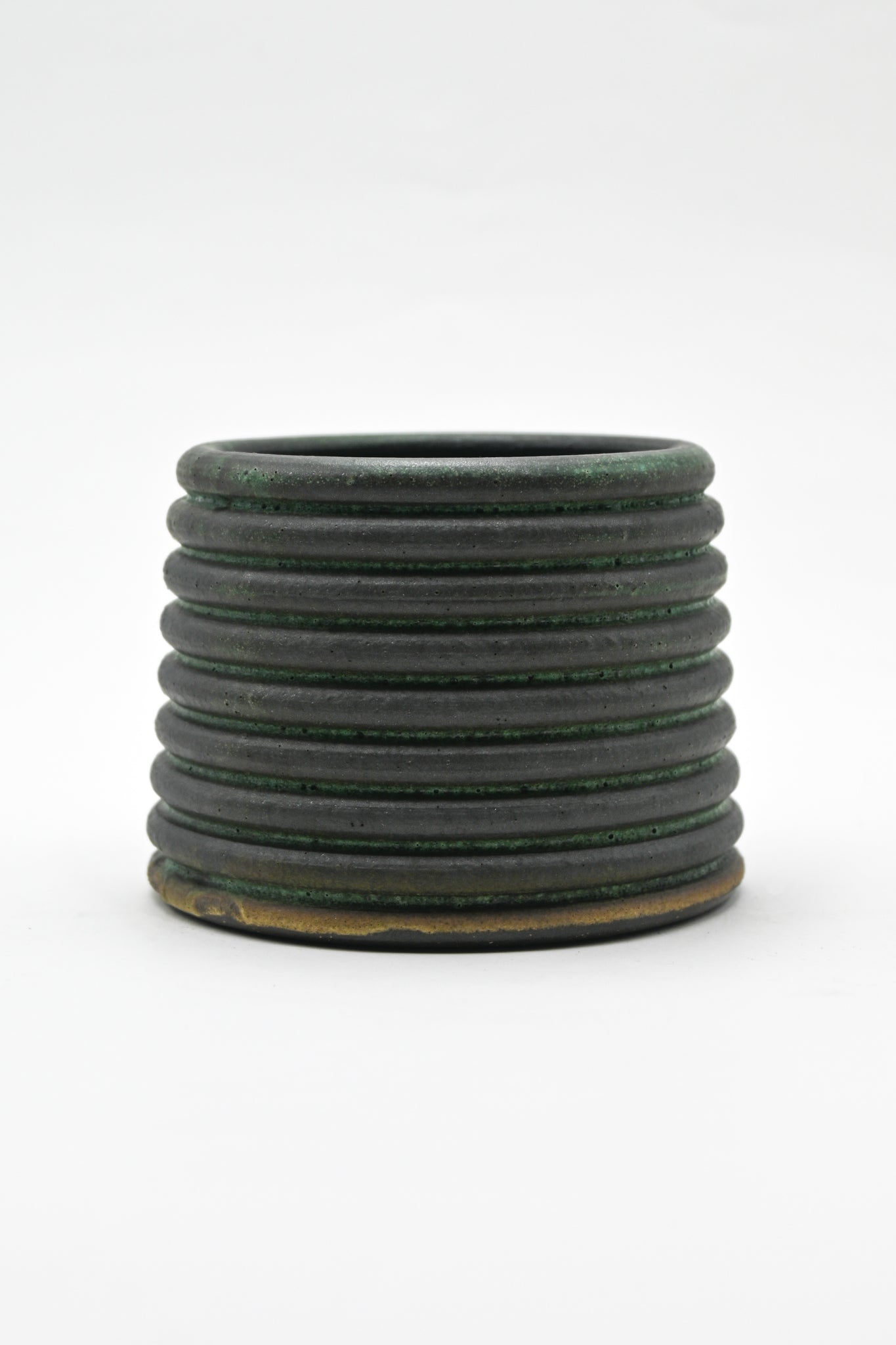 Wheel thrown stoneware tumbler with hand painted glaze design.