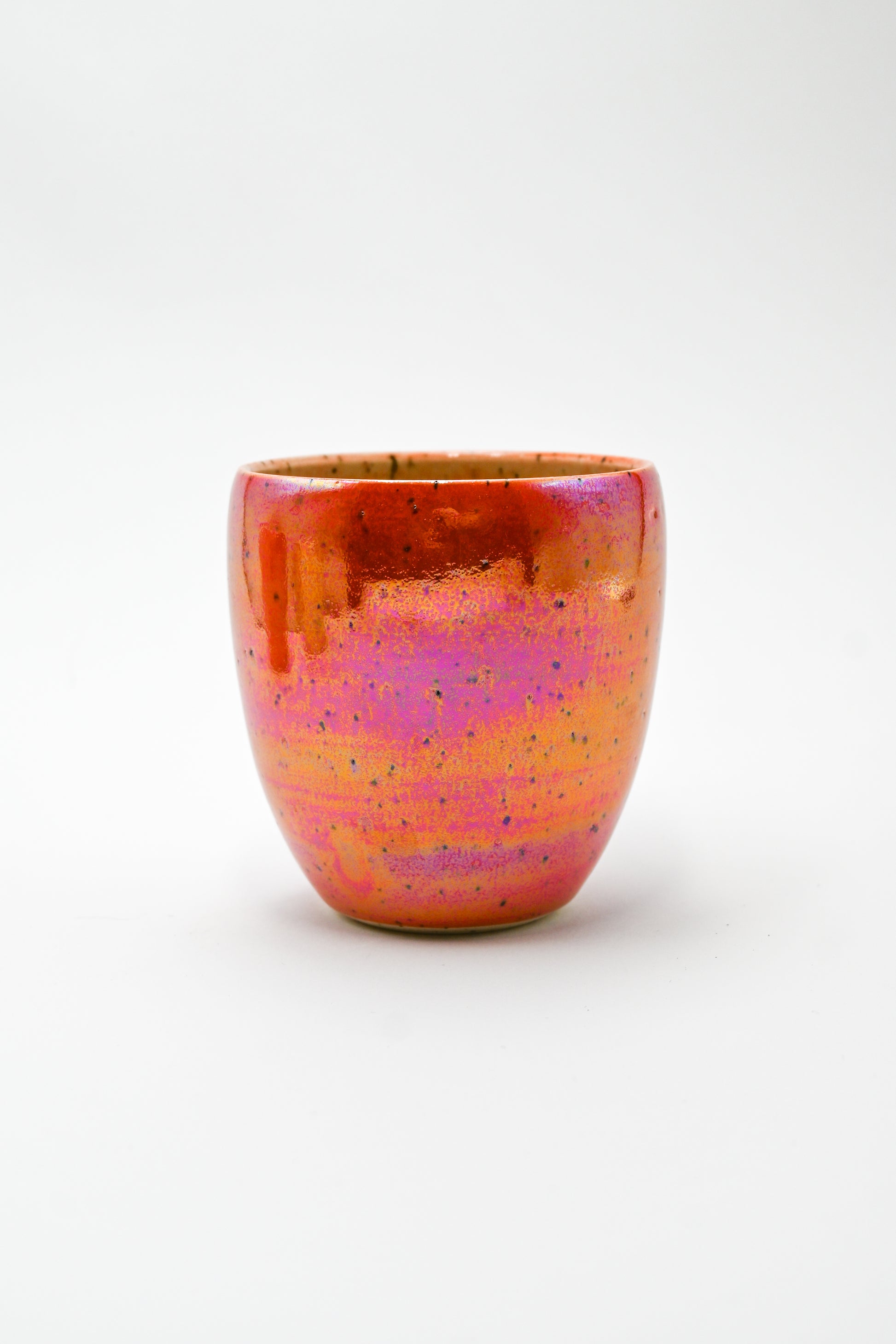 Wheel thrown stoneware tumbler with hand painted glaze. Finished with mother of pearl luster. Food safe.