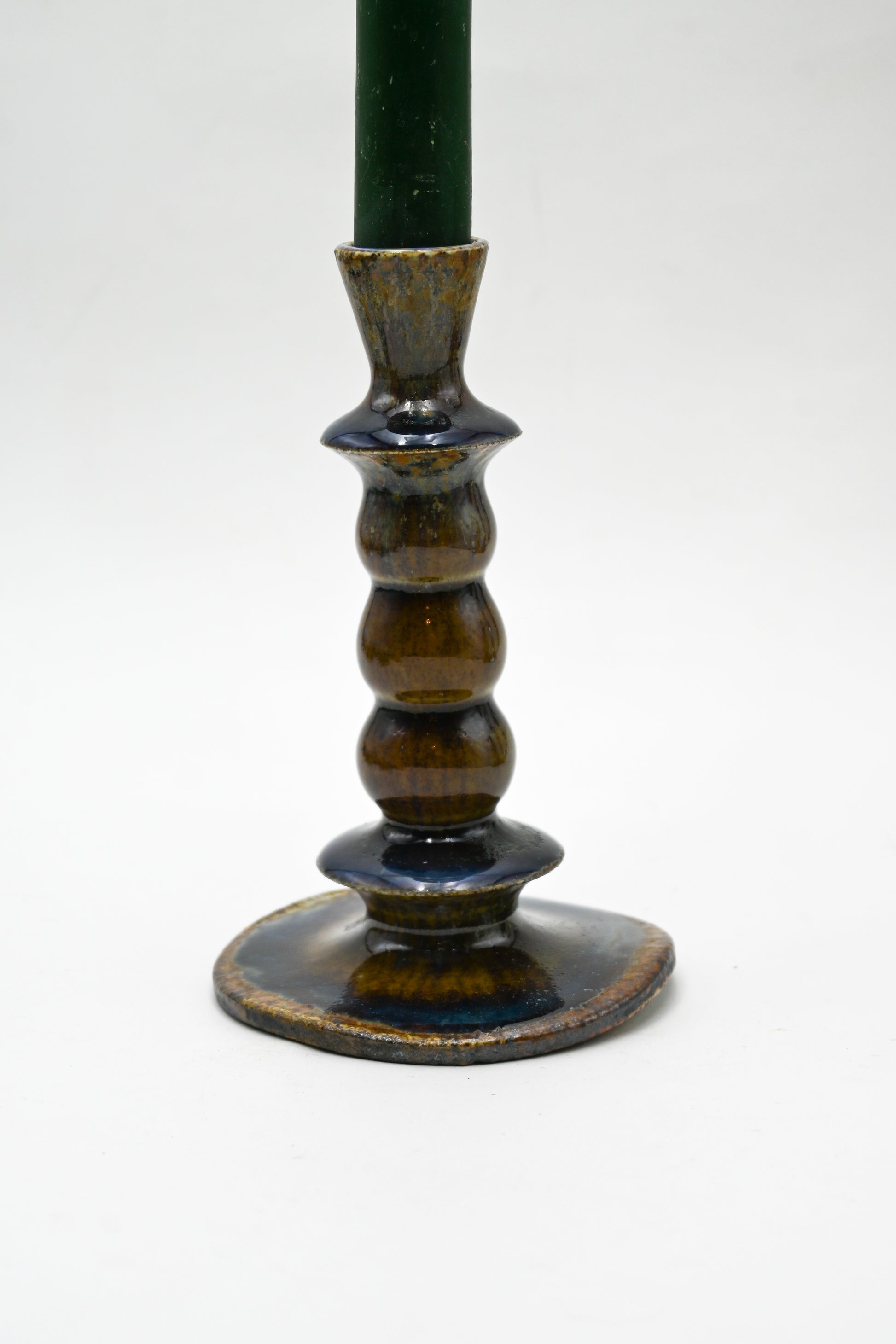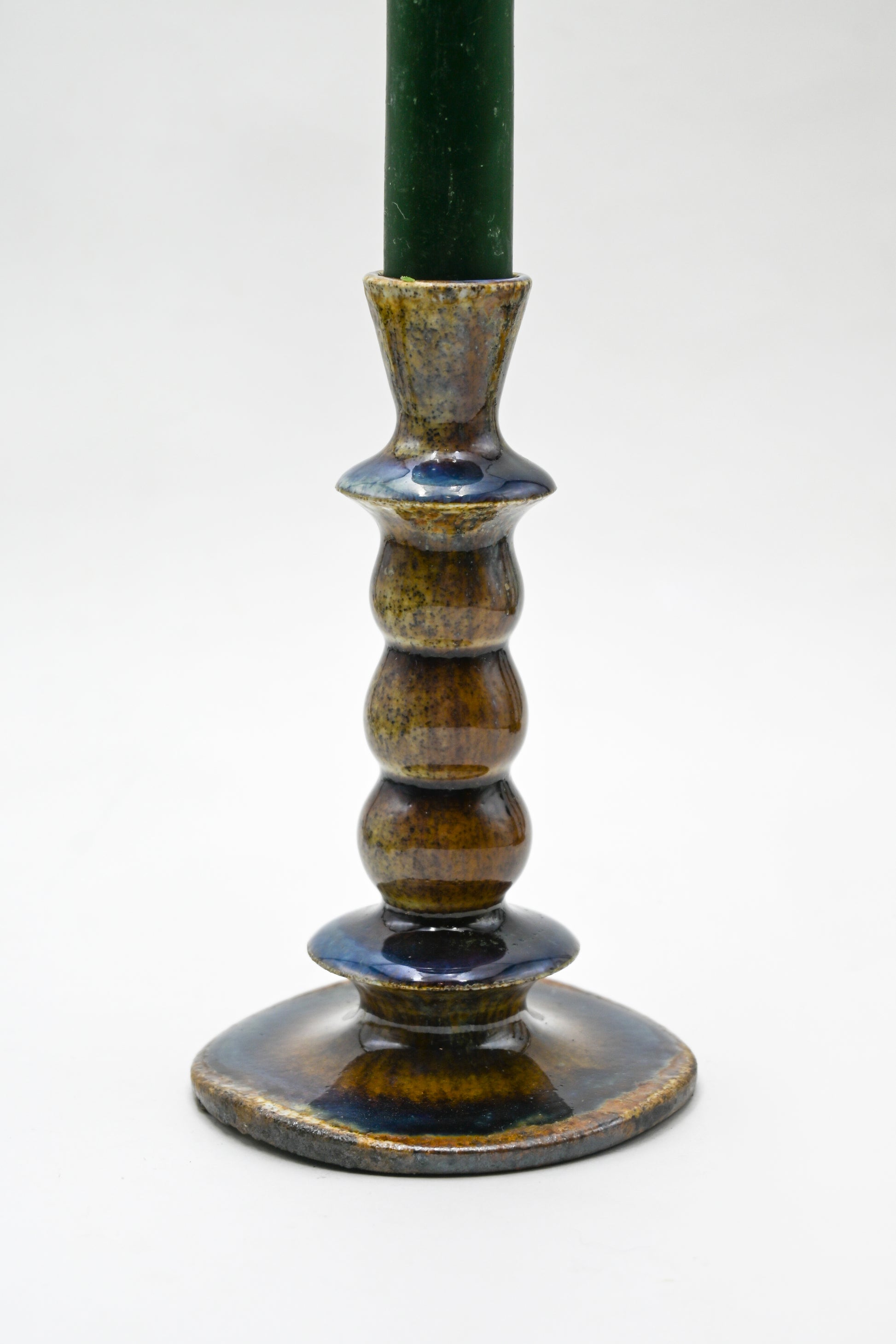 Wheel thrown candle stick holders with hand painted glaze. Wood fired with oak and pine for 24 hours, one of a kind piece. For the longevity of the piece it is recommended to hand wash with care.