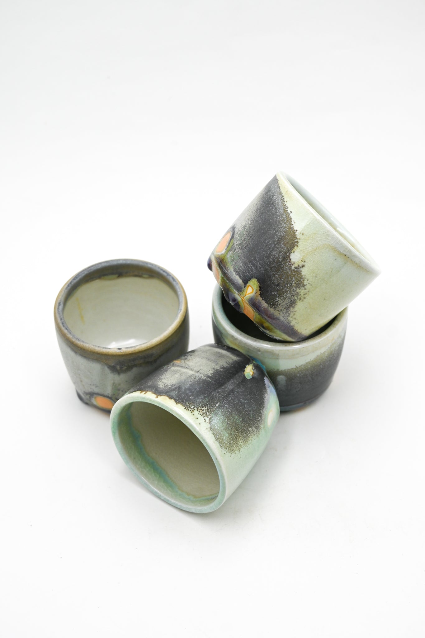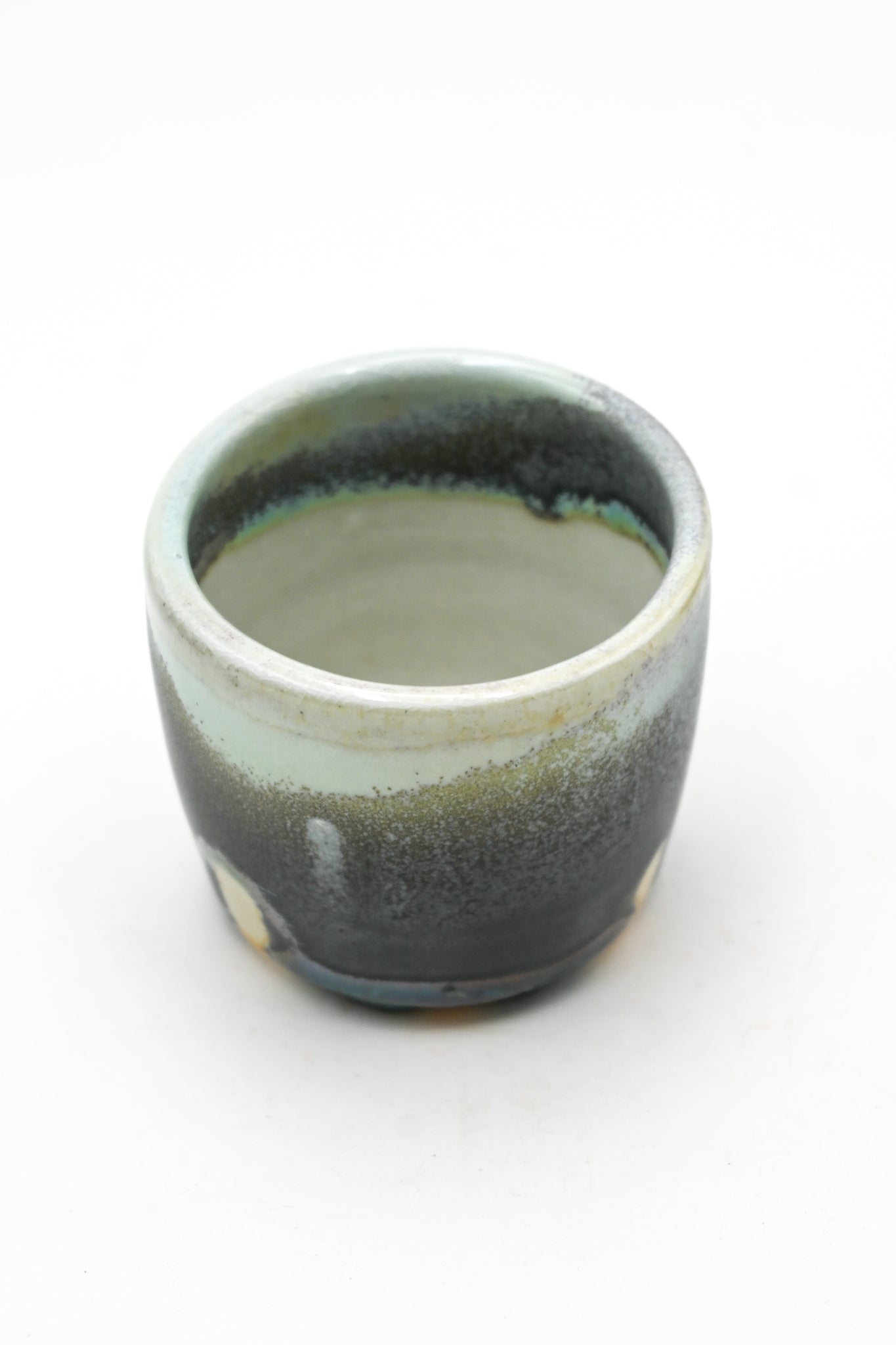 Wheel thrown stoneware cup with hand painted glaze. Food safe.