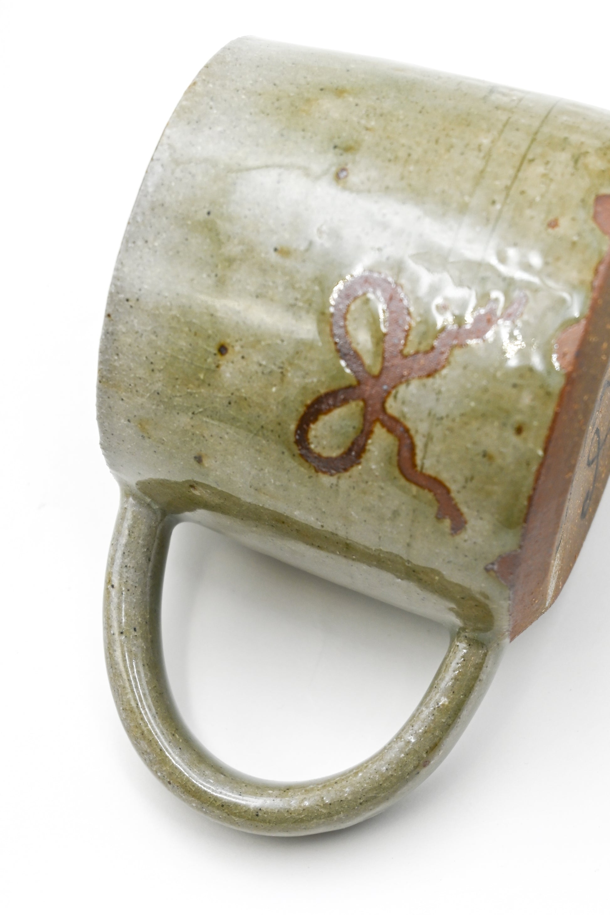 Wheel thrown stoneware mug with hand painted glaze design. Wood fired with oak and pine for 24 hours, one of a kind piece. For the longevity of the piece it is recommended to hand wash with care.