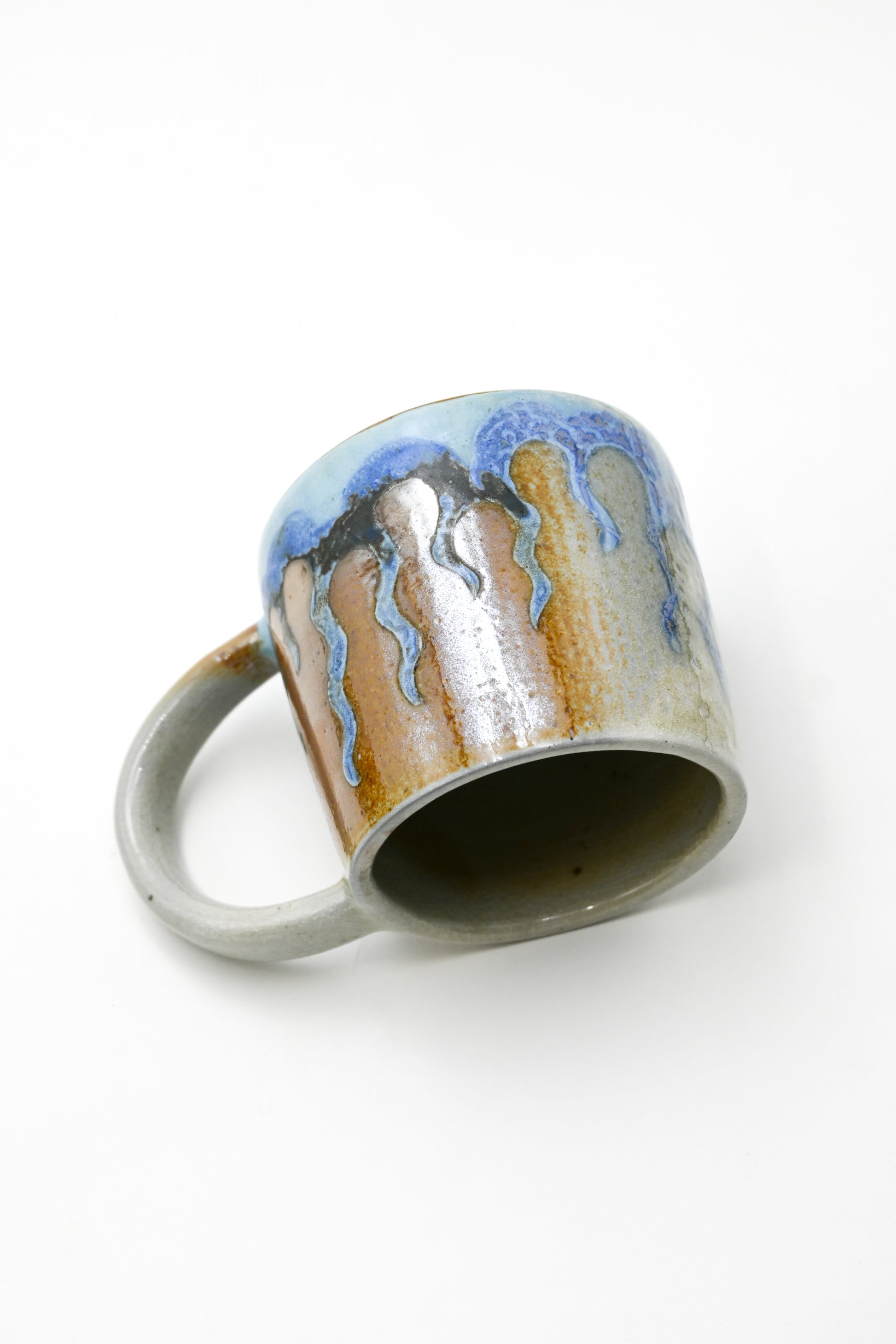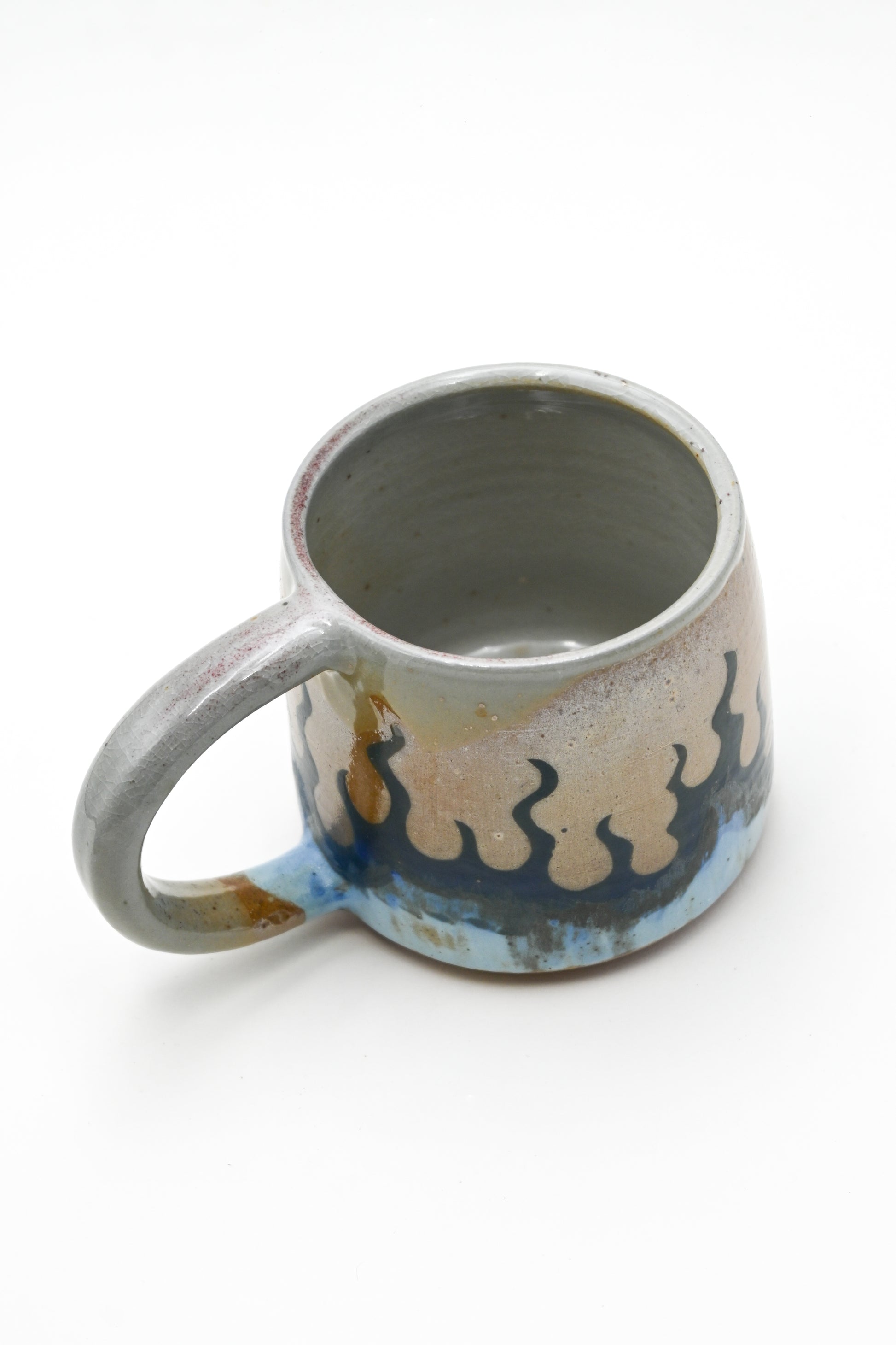 Wheel thrown stoneware mug with hand painted glaze design. Wood fired with oak and pine for 24 hours, one of a kind piece. For the longevity of the piece it is recommended to hand wash with care.