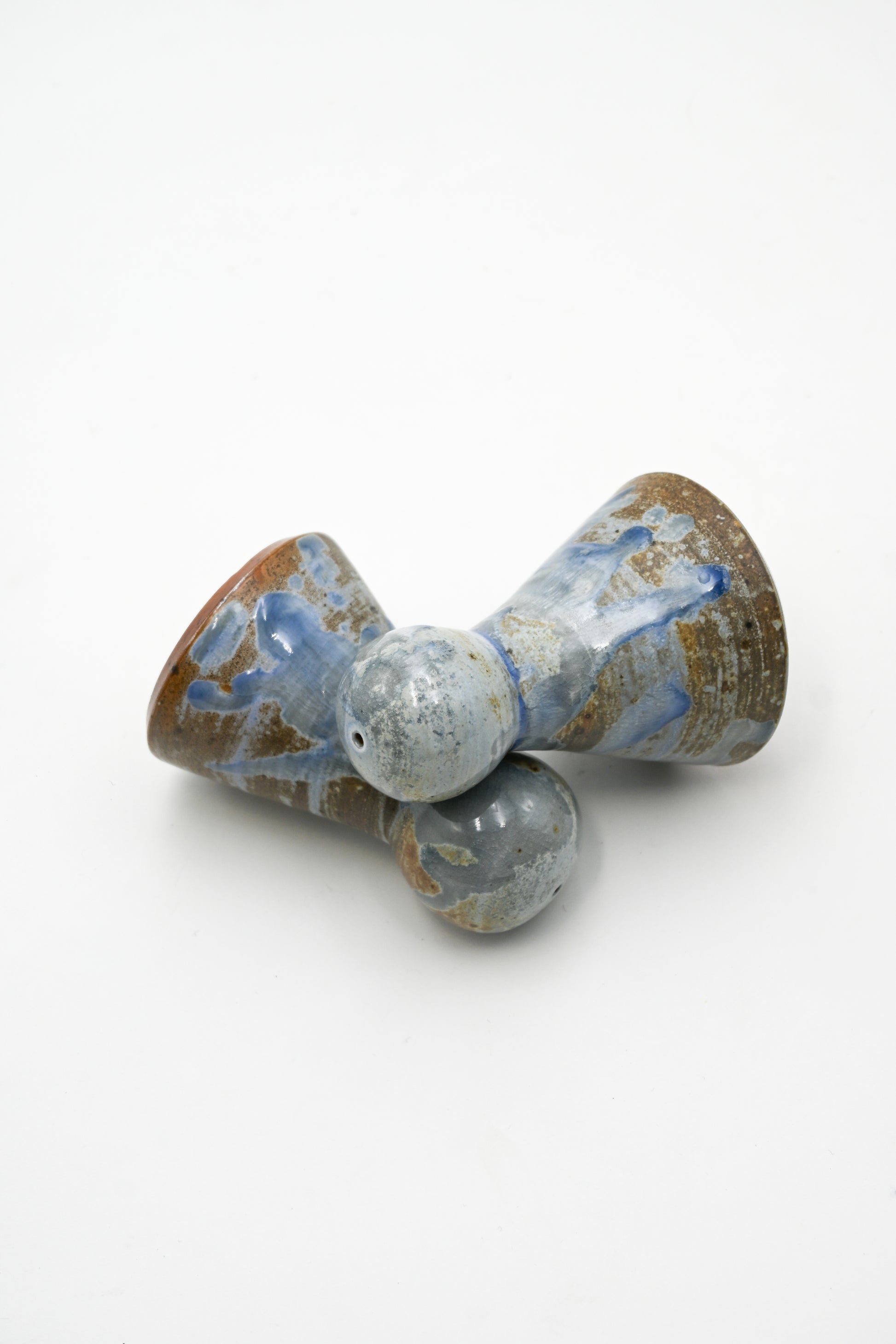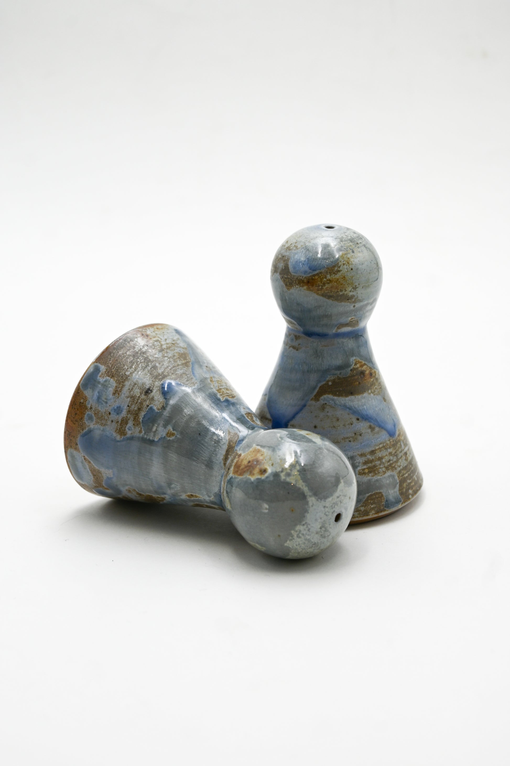 Wheel thrown salt & pepper shakers with cork stopper and hand painted glaze design. Wood fired with oak and pine for 24 hours, one of a kind piece. For the longevity of the piece it is recommended to hand wash with care.
