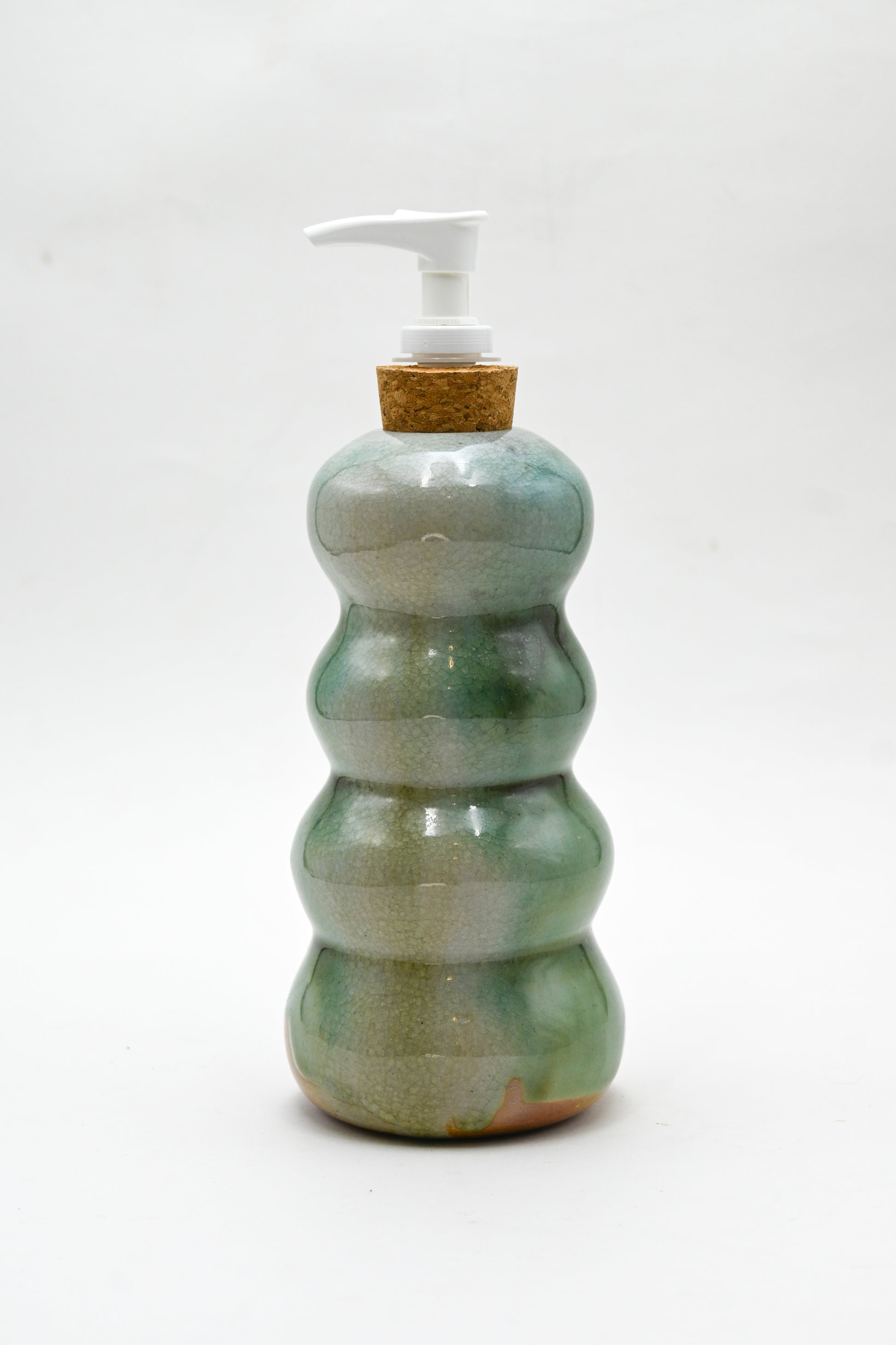 Wood fired wheel thrown stoneware soap dispenser with hand painted glaze design. Cork soap pump top included, this vessel can also be used as a small vase!