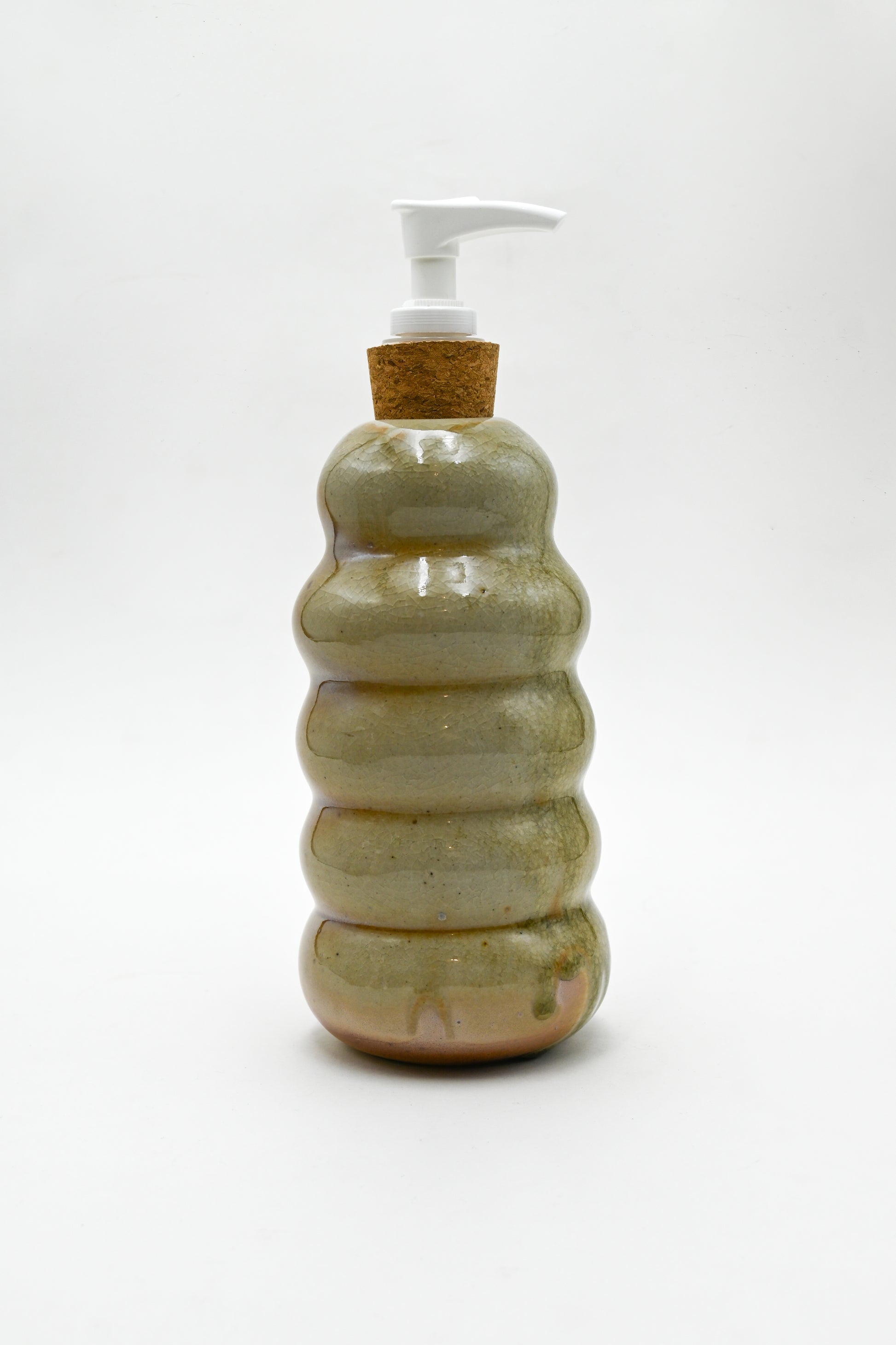 Wood fired wheel thrown stoneware soap dispenser with hand painted glaze design. Cork soap pump top included, this vessel can also be used as a small vase!