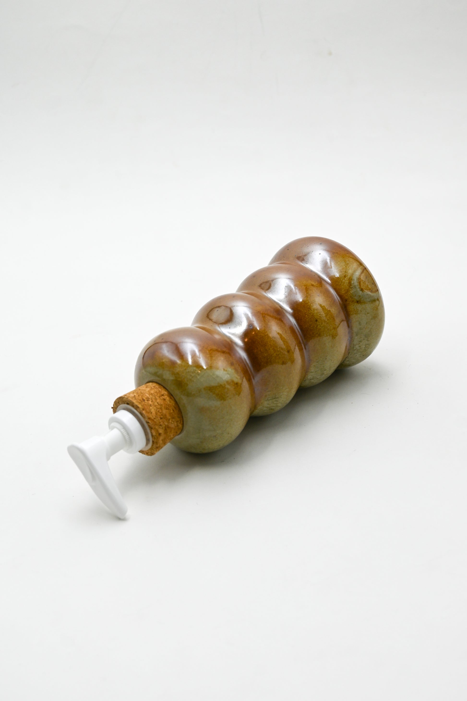Wood fired wheel thrown stoneware soap dispenser with hand painted glaze design. Cork soap pump top included, this vessel can also be used as a small vase!