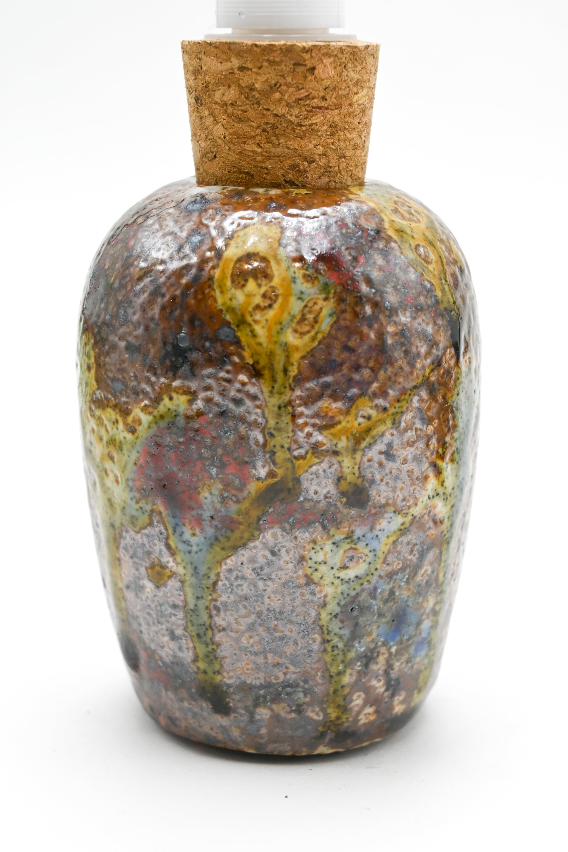 Wood fired wheel thrown stoneware soap dispenser with hand painted glaze design. Cork soap pump top included, this vessel can also be used as a small vase!