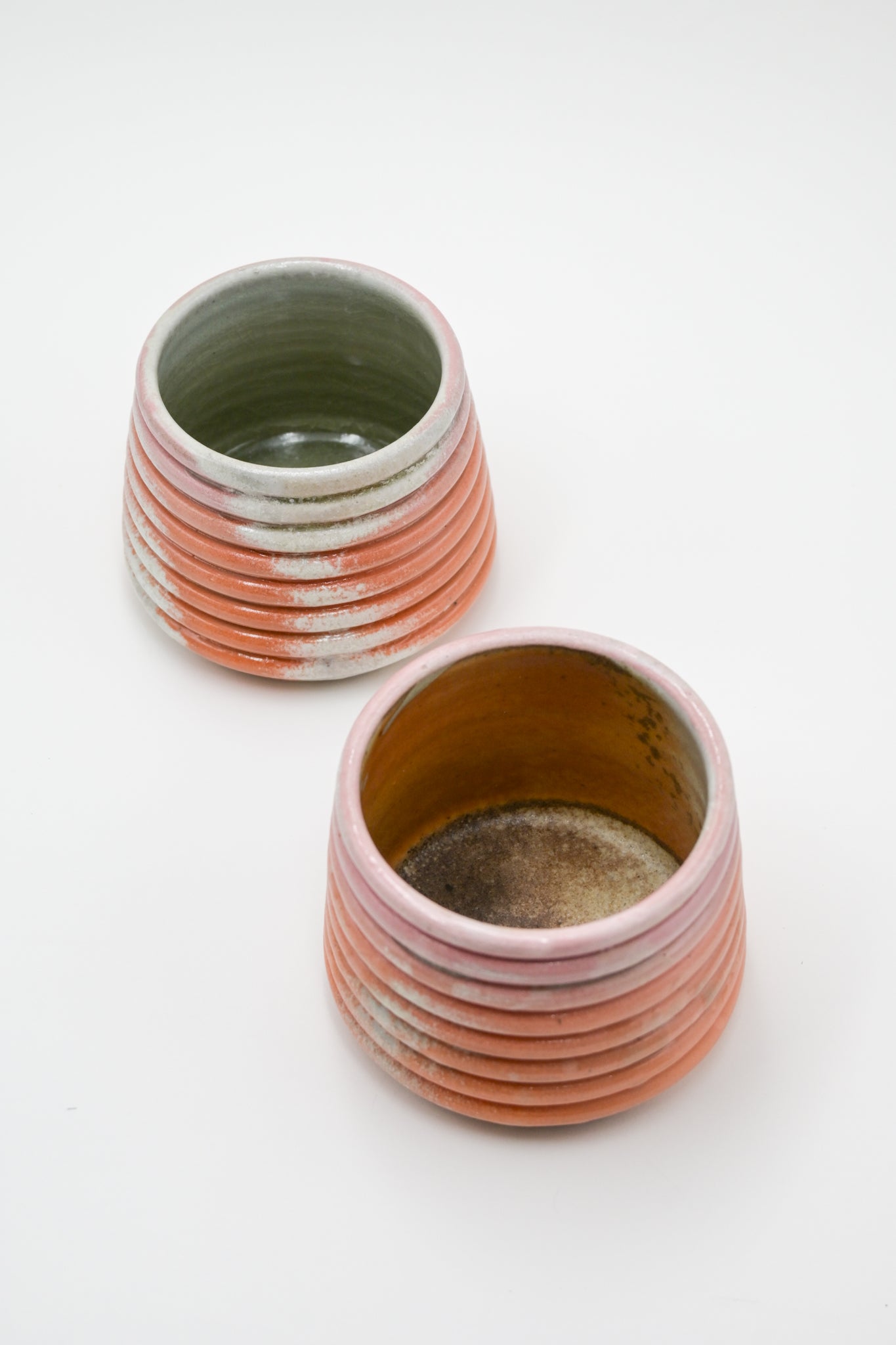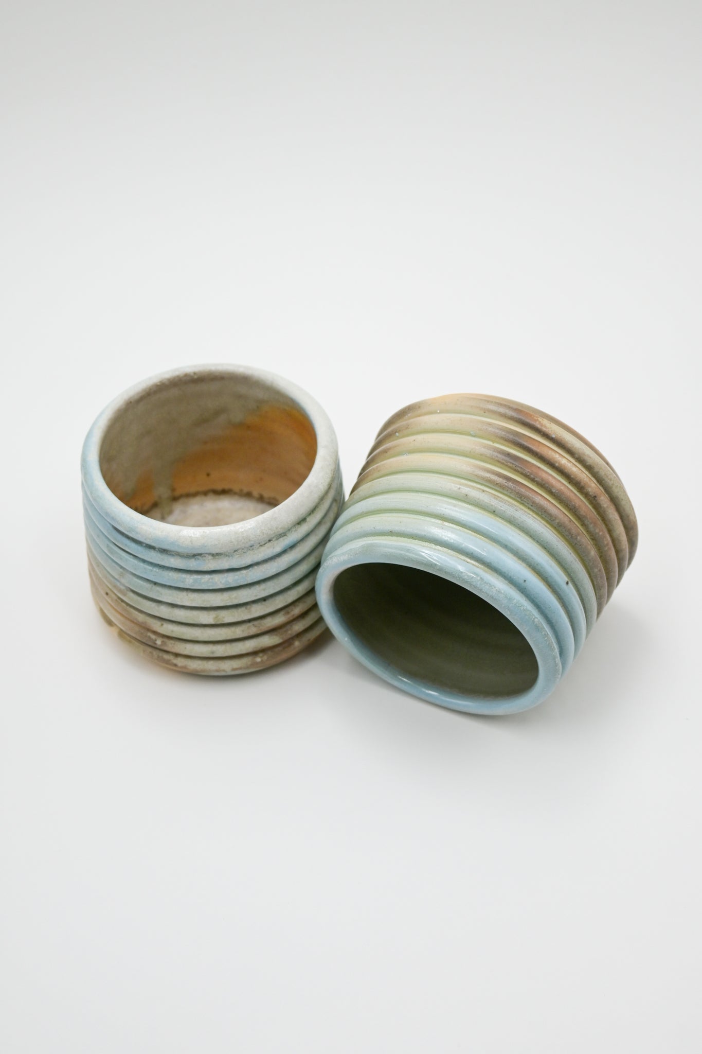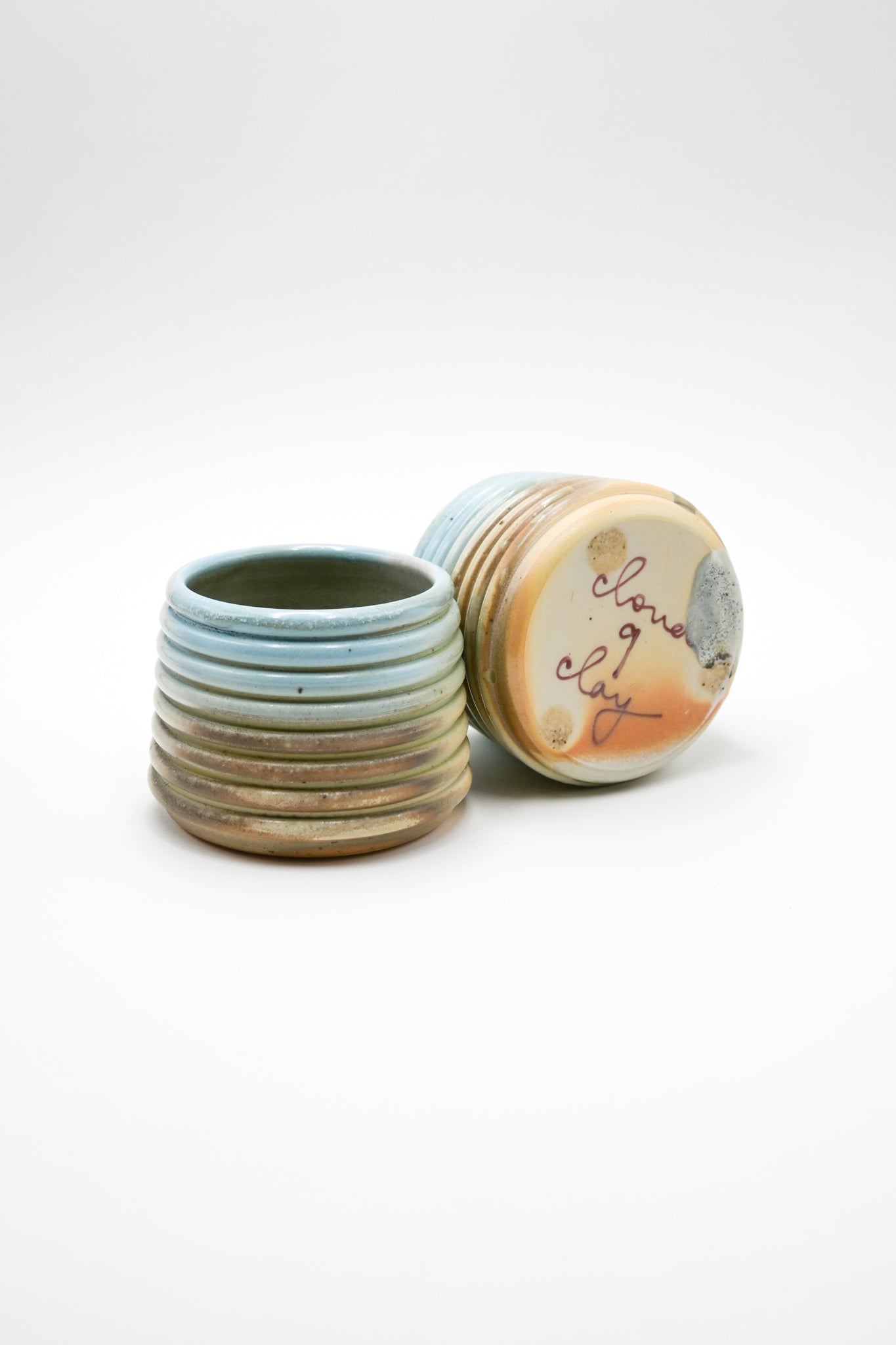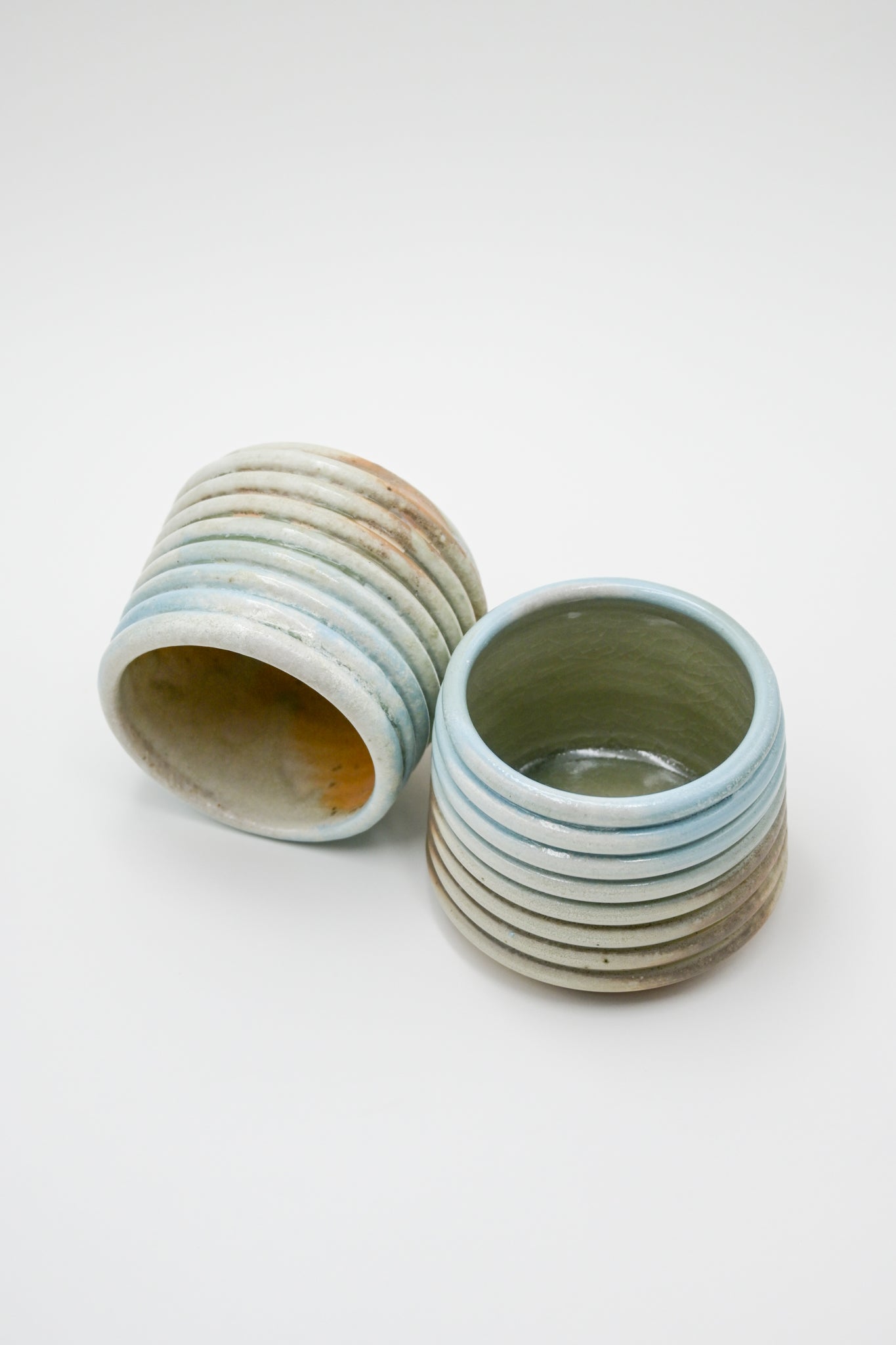 Wood fired wheel thrown stoneware tumblers with hand painted glaze. Wood fired in an atmospheric kiln for 48+ hours, each piece is one of a kind. Please note the interior / exterior glaze colors. Shino is the warm orange/brown interior glaze & Celadon is the blue/green interior glaze.