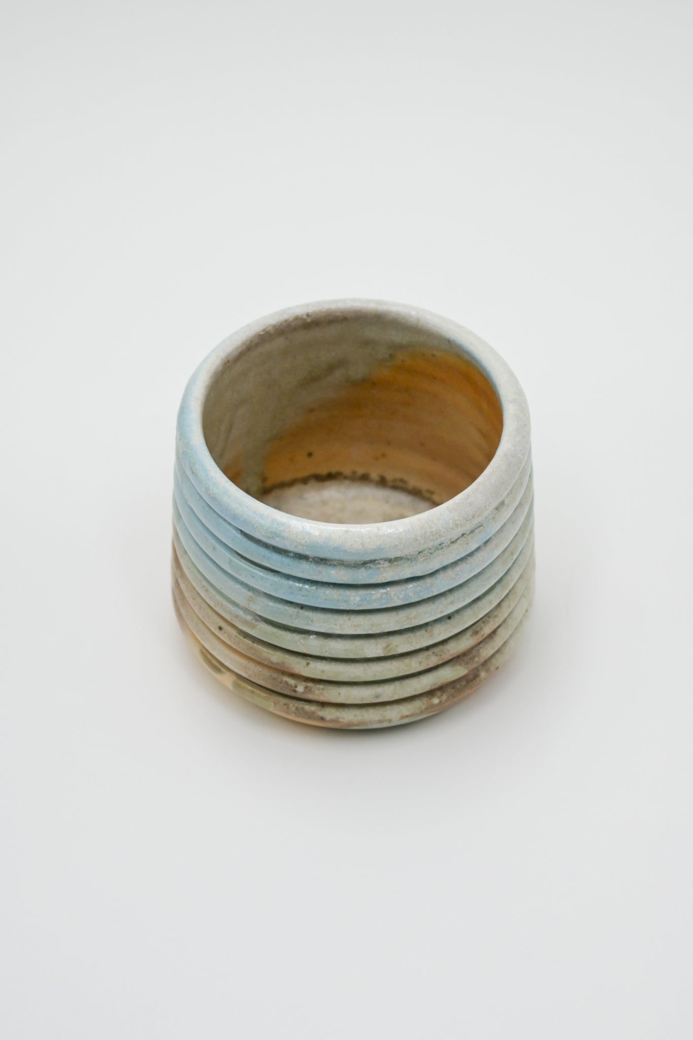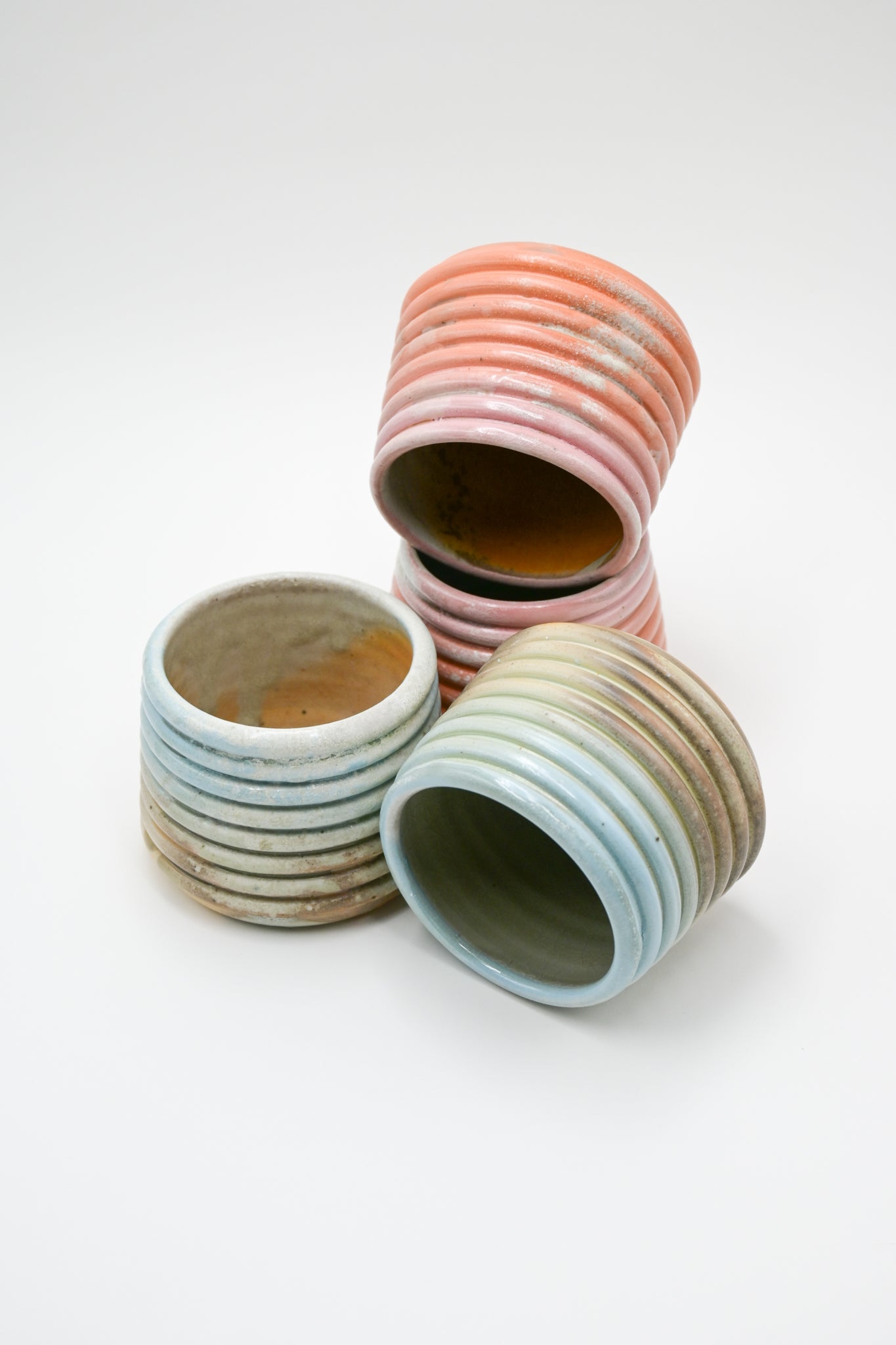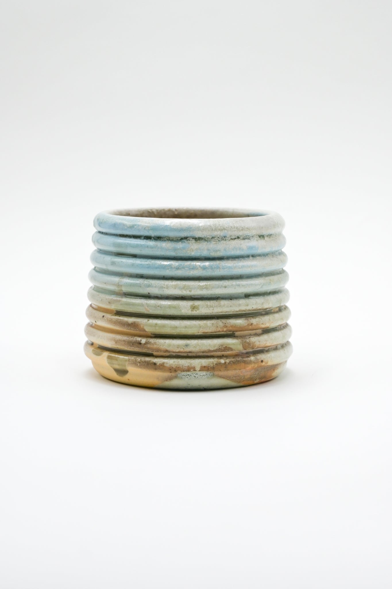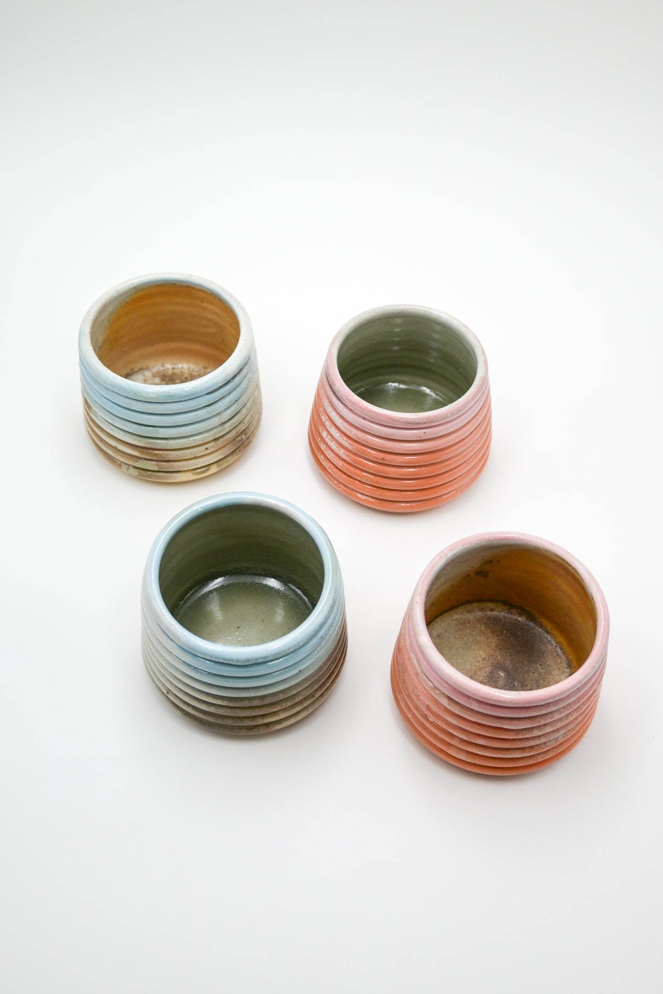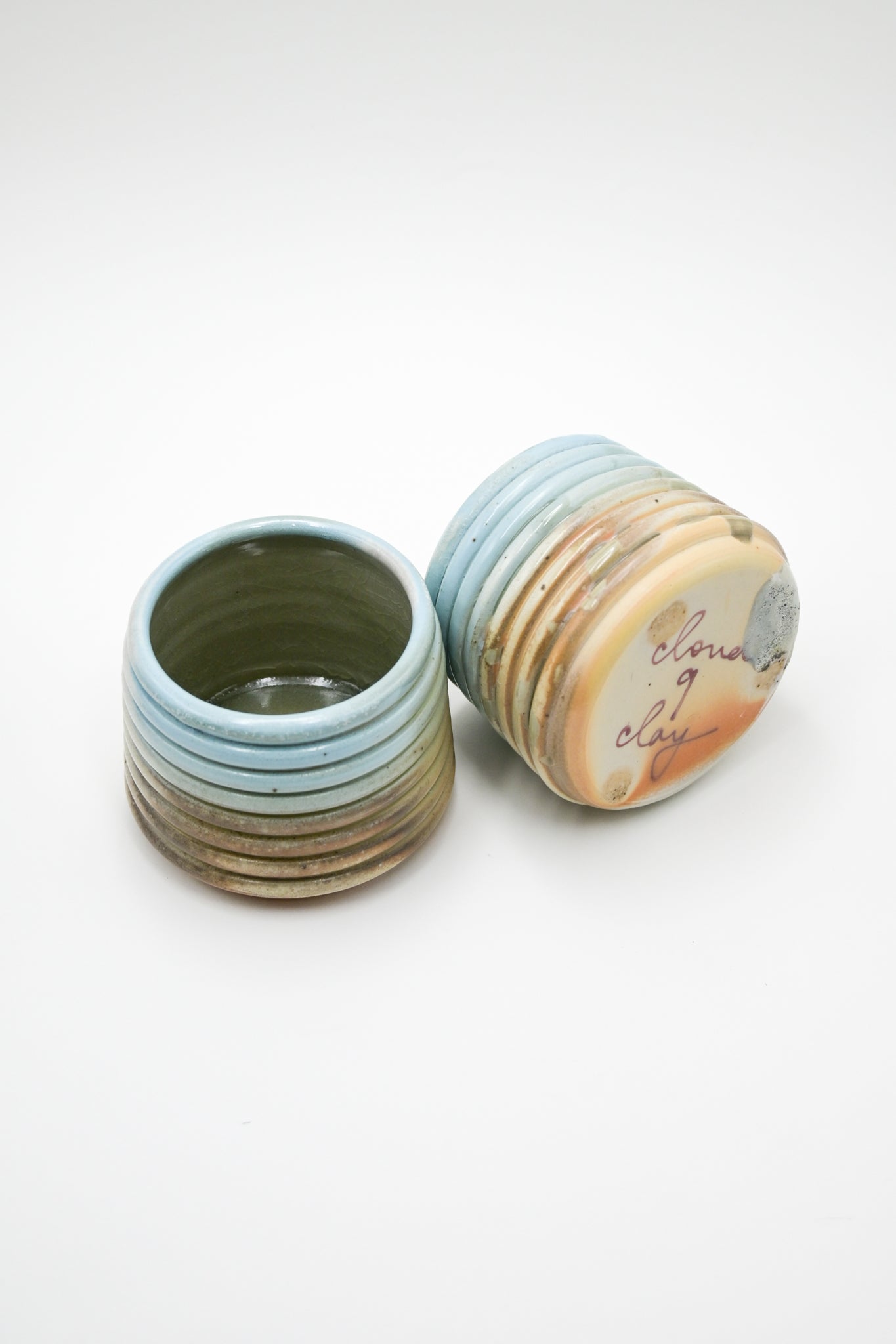 Wood fired wheel thrown stoneware tumblers with hand painted glaze. Wood fired in an atmospheric kiln for 48+ hours, each piece is one of a kind. Please note the interior / exterior glaze colors. Shino is the warm orange/brown interior glaze & Celadon is the blue/green interior glaze.