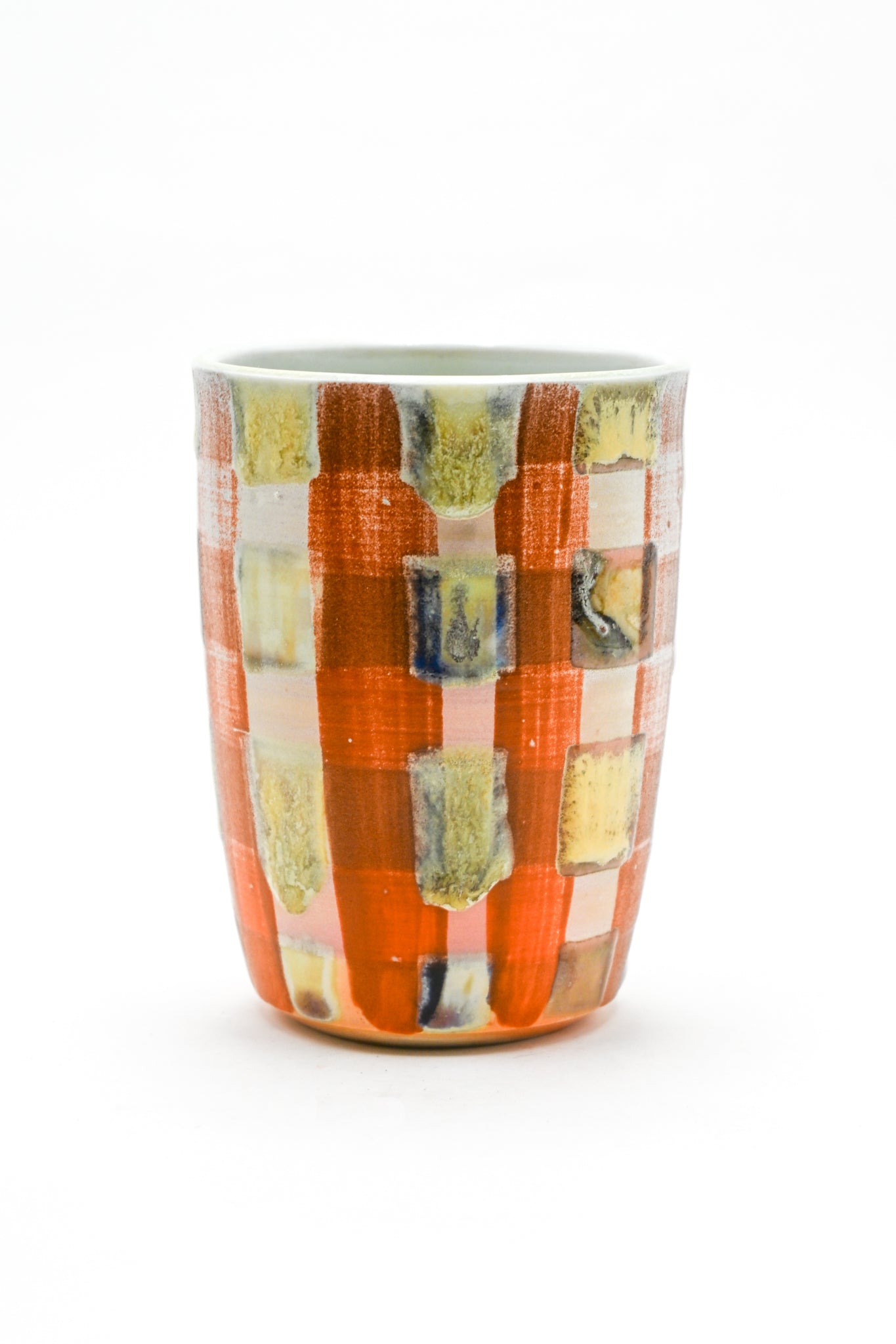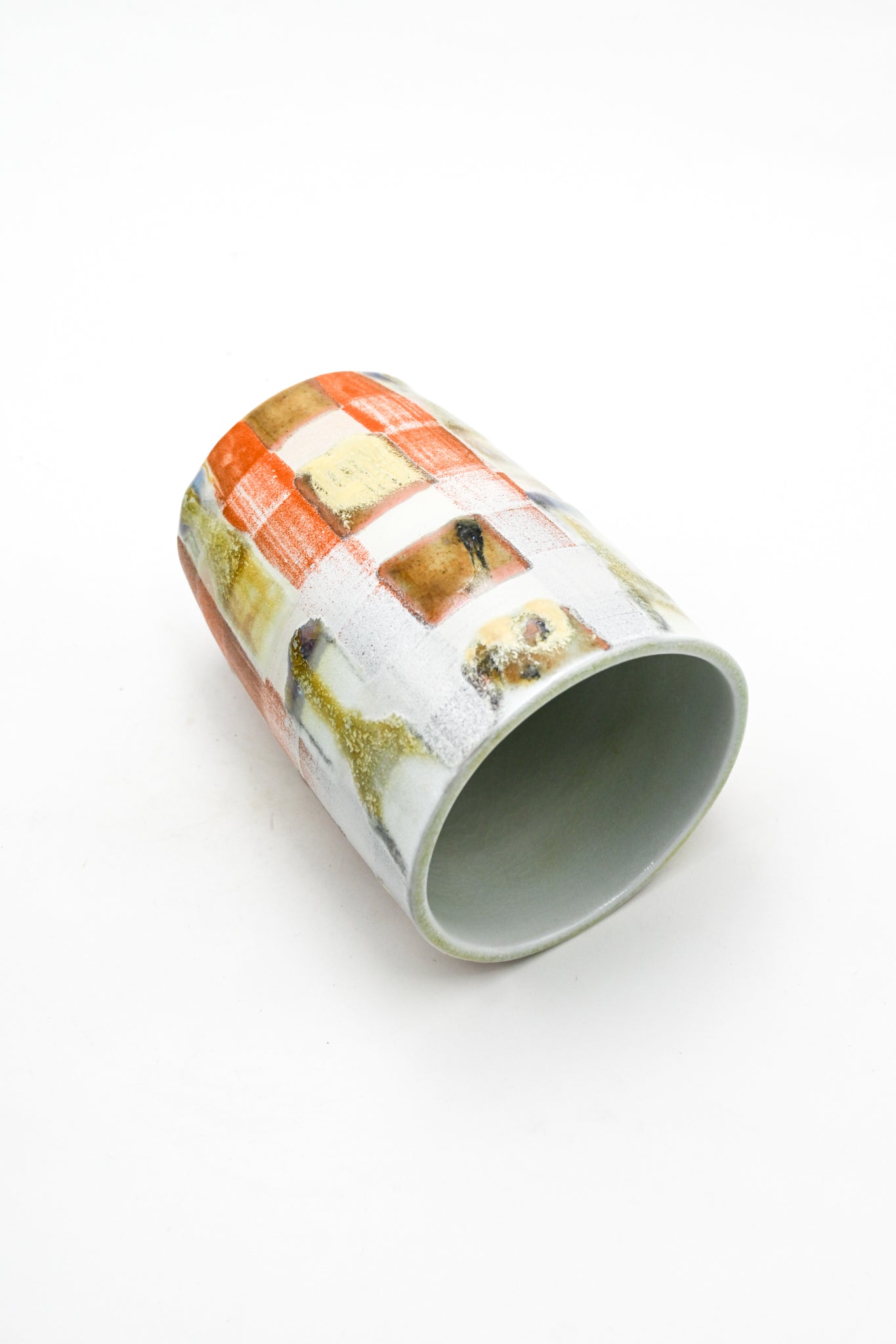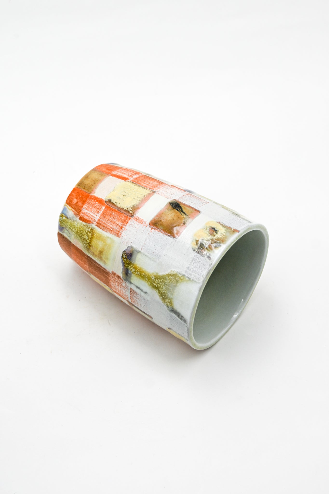 Wheel thrown porcelain tumbler with hand painted glaze design. Wood fired with oak and pine for 36 hours, one of a kind piece.