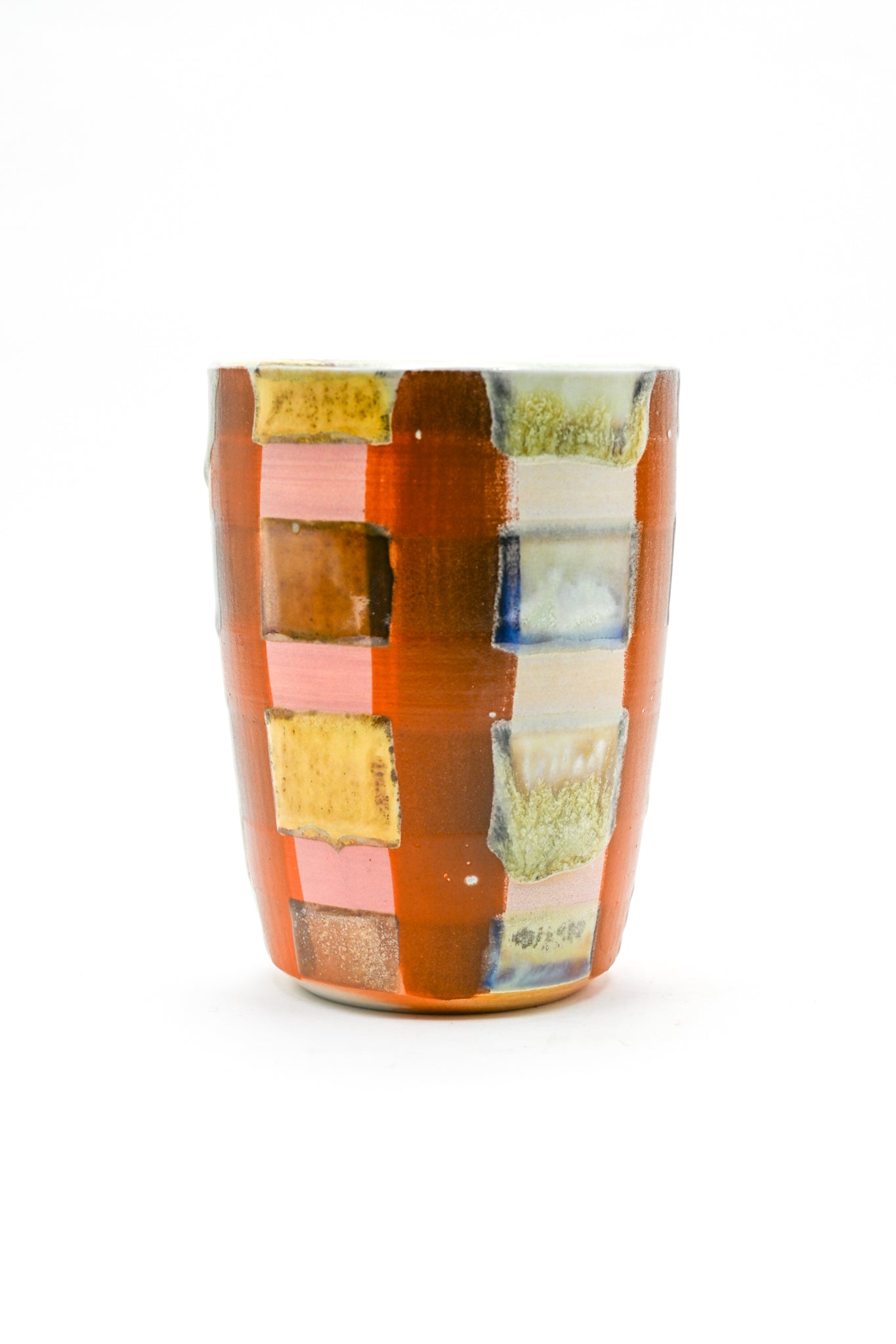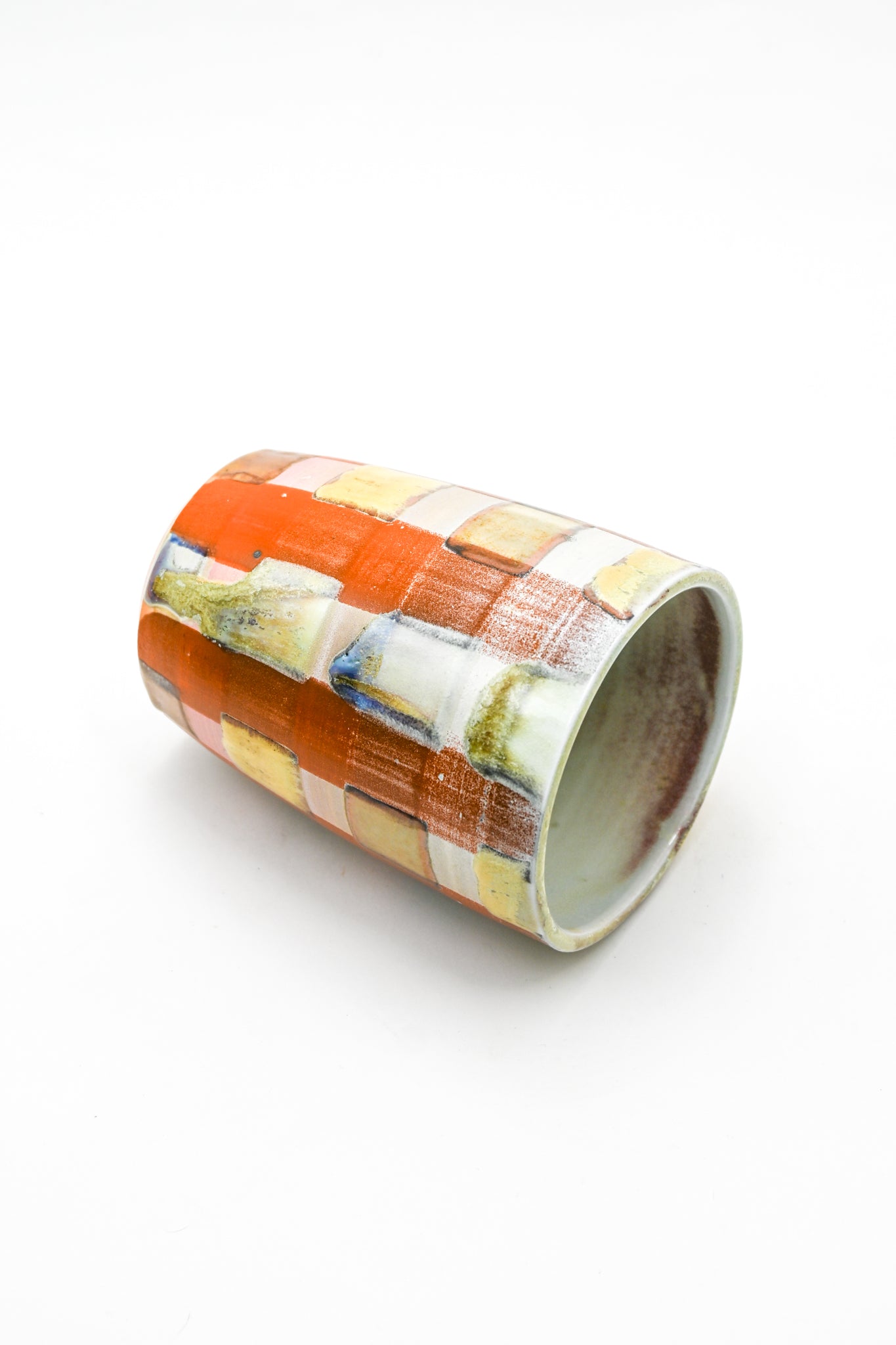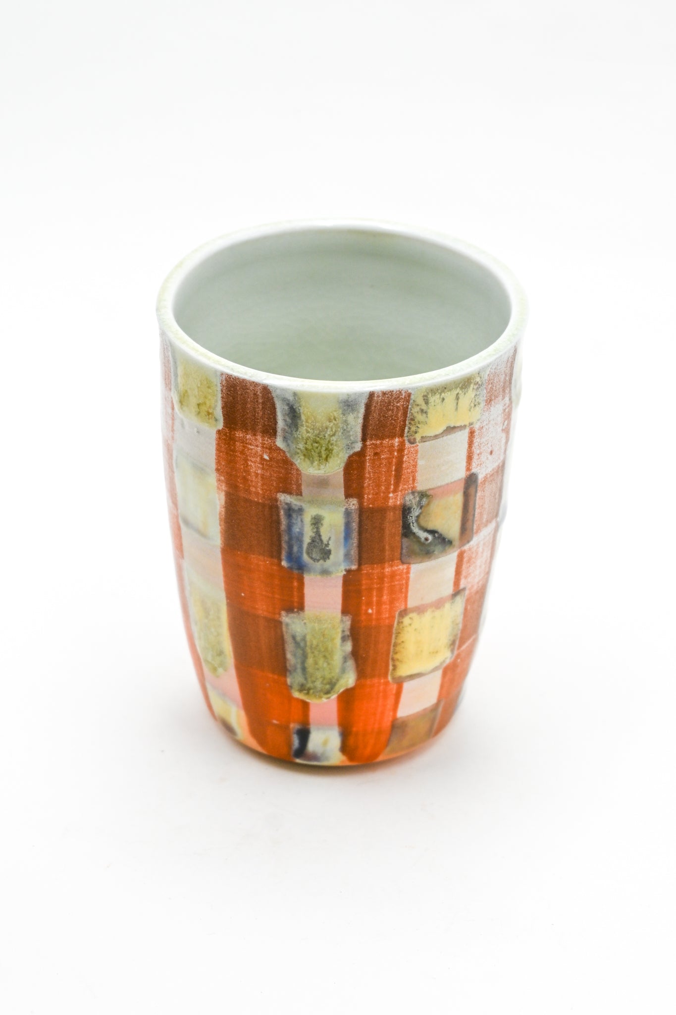 Wheel thrown porcelain tumbler with hand painted glaze design. Wood fired with oak and pine for 36 hours, one of a kind piece.