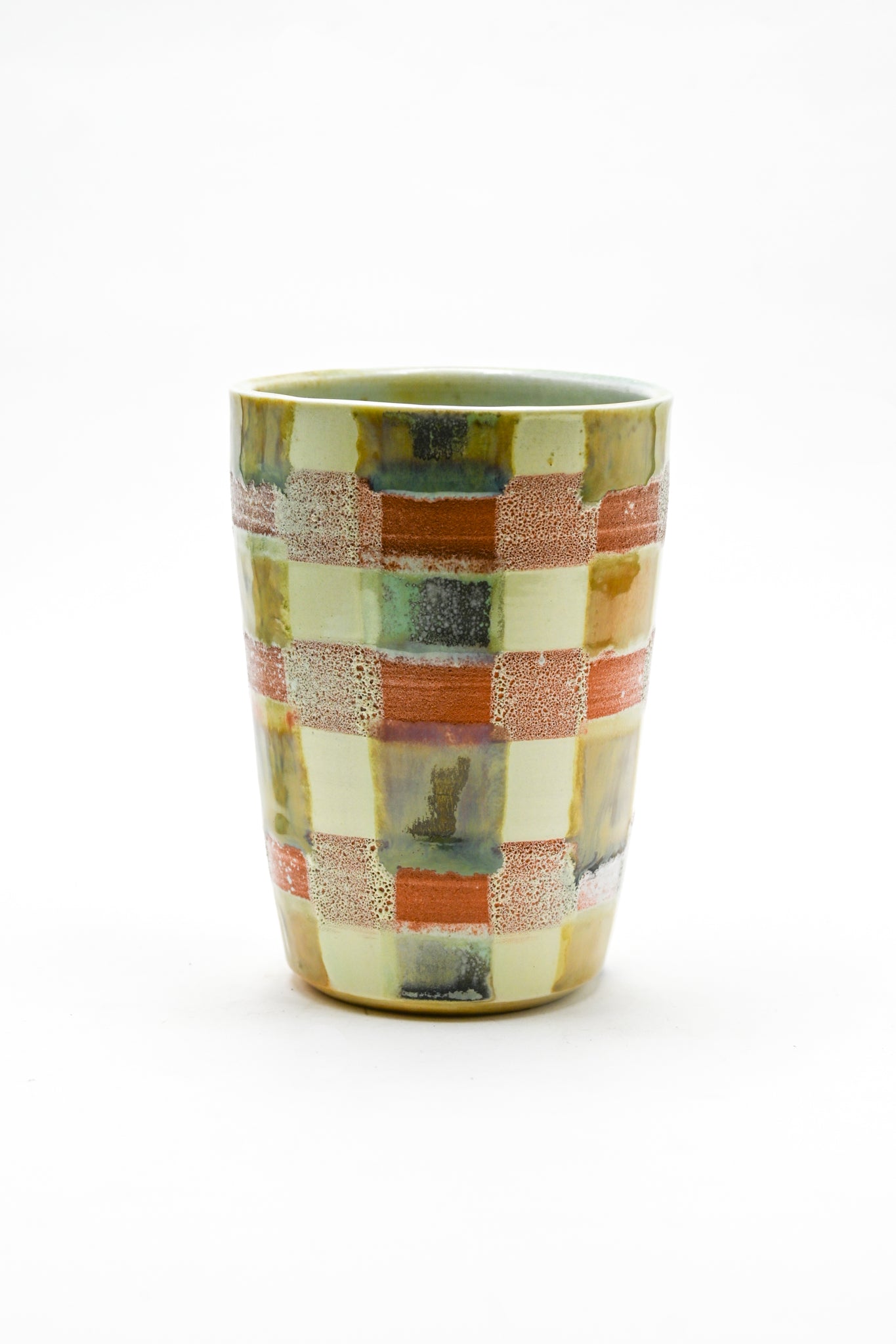 Wheel thrown porcelain tumbler with hand painted glaze design. Wood fired with oak and pine for 36 hours, one of a kind piece.